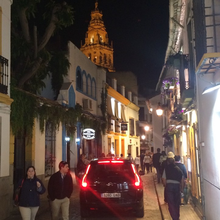 Walking back to our hotel, and well after dark, we see the lighted tower of the Mezquita.