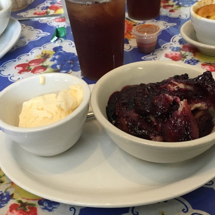 In addition to barbecue, the draw here is blackberry cobbler. This was my BIG serving of blackberry cobbler. Could not eat it all.