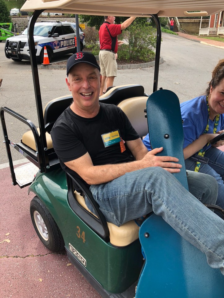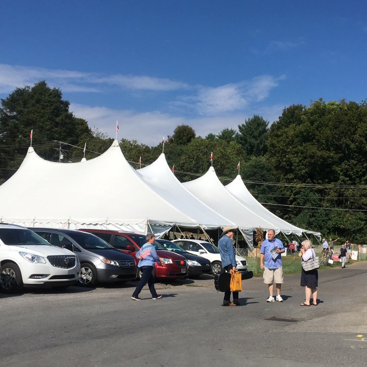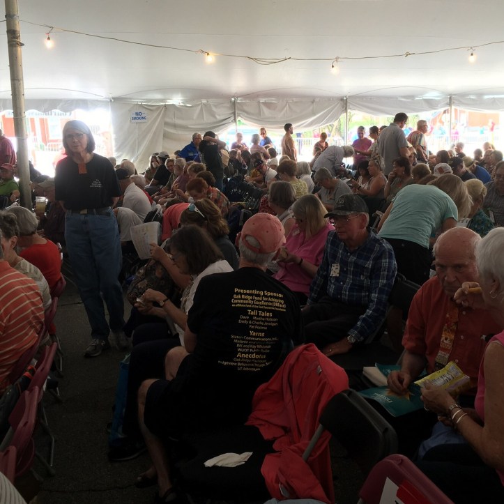 With all the the people attending, it’s important to know which storyteller is appearing in what tent and when, and where we each want to go. The schedule is in one-hour segments with either one or two tellers during that time. That’s followed by half-hour breaks to move to a different tent, take a potty break, or search for snacks. This year there were 23 tellers and each of them appeared multiple times during the festival telling different stories. The typical day goes from 10 am to 10 pm with a midnight session plus an evening of ghost stories thrown in. We can’t do it all and have to be selective although two tellers – Bil Lepp and Donald Davis – are must-sees. Starting at 10 am Friday, there will be storytellers in each of five big circus-type tents. The one below is the College Tent.