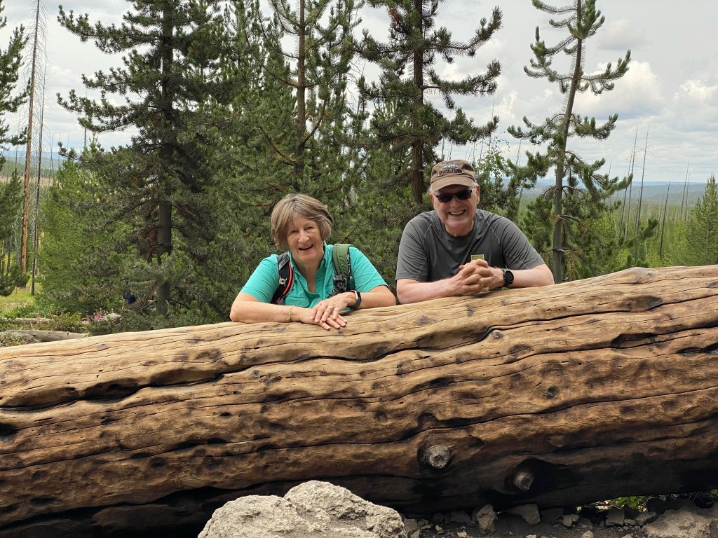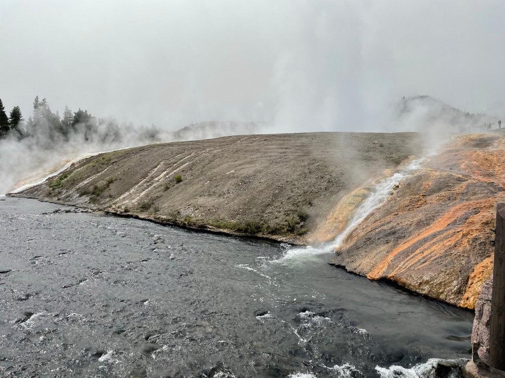 We continued along the boardwalk to Grand Prismatic Spring, one of Yellowstone’s largest and most brilliant hot springs. Today it was covered with so much steam because the outside air was so cool, that it was hard to see much. It’s 200 feet across and the water at 169 degrees keeps the spring covered in steam. The orange color encircling the spring is caused by thermophiles, bacteria-like organisms that thrive at high temperatures.