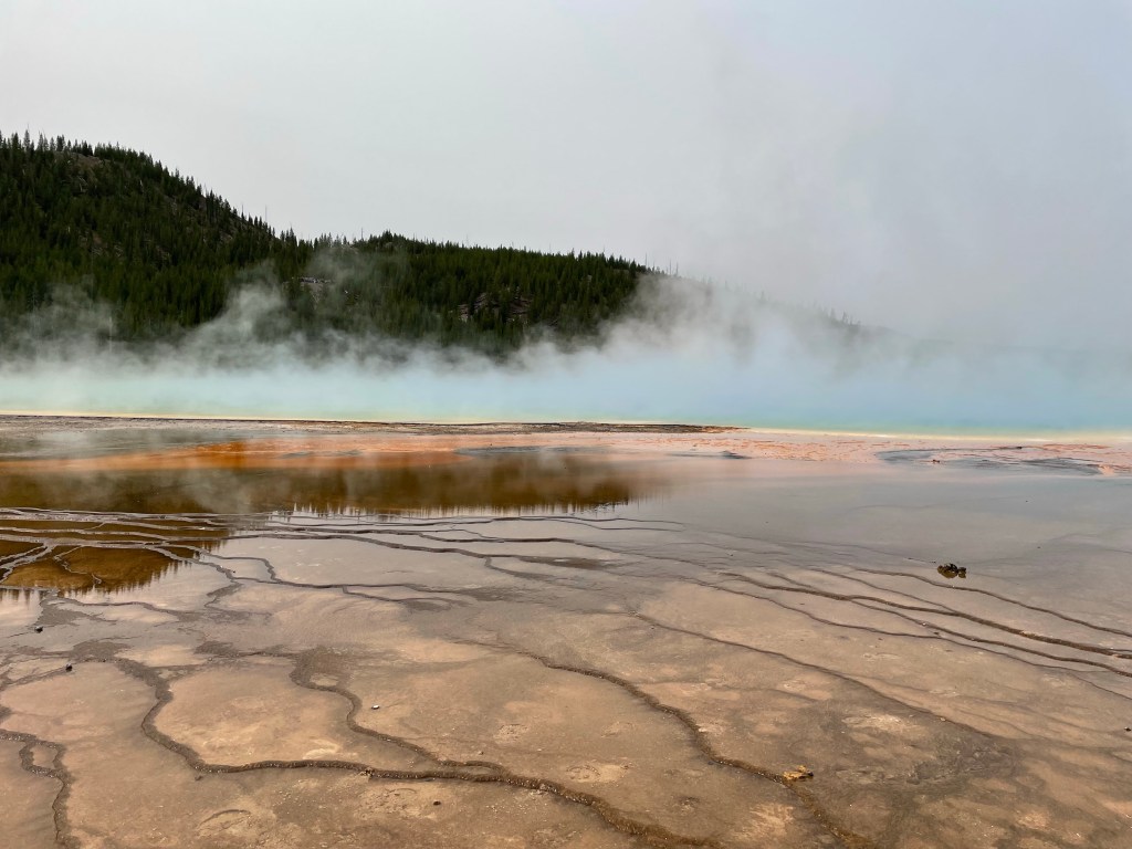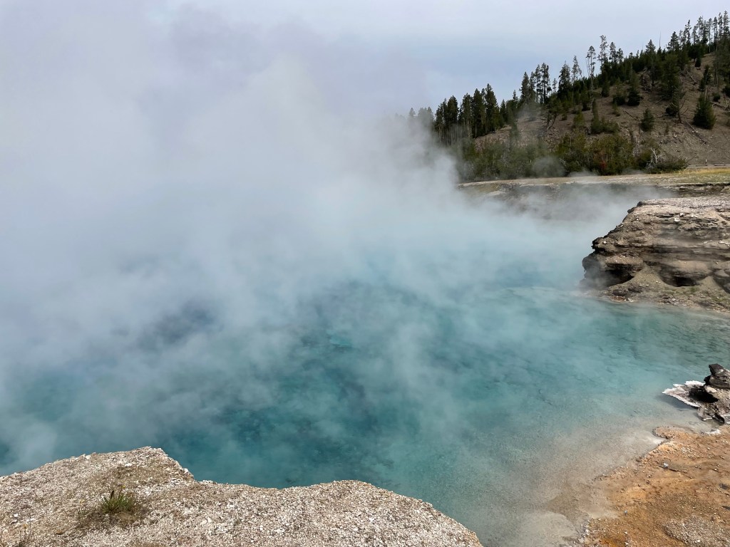 The Excelsior Geyser first erupted in the 1880s creating the jagged crater but ceased eruptions after 1890. Then in 1985 it erupted for 47 hours before ceasing again. It doesn’t erupt now but boils as a hot spring. I read that the current issue at Yellowstone is earthquakes rather than concern about volcanic activity. Between 700 to 3,000 earthquakes occur in the park each year, but most are 2 or 3 on the Richter Scale and are not felt. They result from the network of faults associated with the volcano but are likely caused by changes in snow melt, not magmatic activity. But the earthquakes can be responsible for tectonic shifts underground and cause geysers to cease erupting or vice versa. In July this year, there were 1.000 quakes – more than 700 in one day under Yellowstone Lake.
