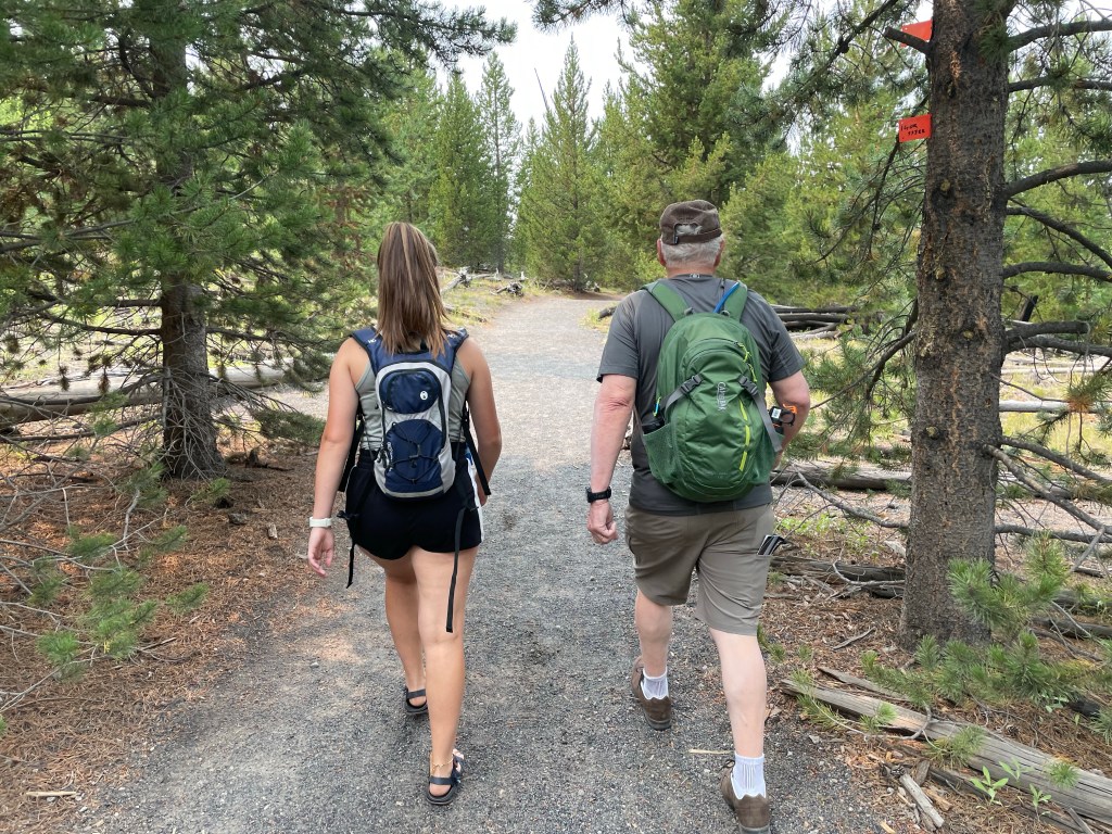 Next stop was Fairy Falls Trailhead. From the parking lot, the trail crosses a steel bridge over the Firehole River, then continues along the Fountain Freight Road for a mile, before turning left onto the Fairy Falls Hiking trail. This was a six-mile round trip for us. Most of the walk was through forest that had burned in 1988 and now 30 years later, was recovering.