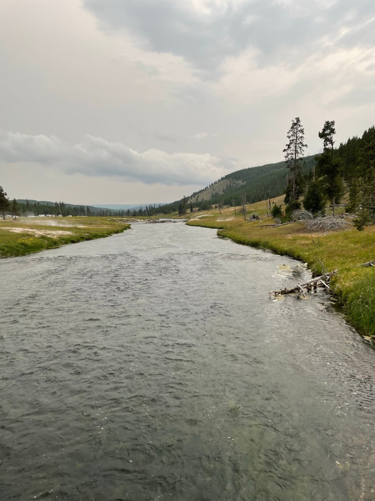 Then it took us 30 minutes to drive to Midway Geyser Basin and Grand Prismatic Spring. Although the parking lot was full, we didn’t have to wait long to find a spot. We were traveling along the Firehole River on the way there.