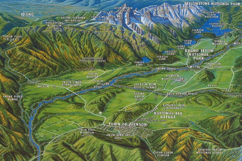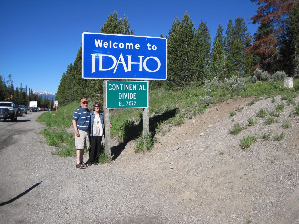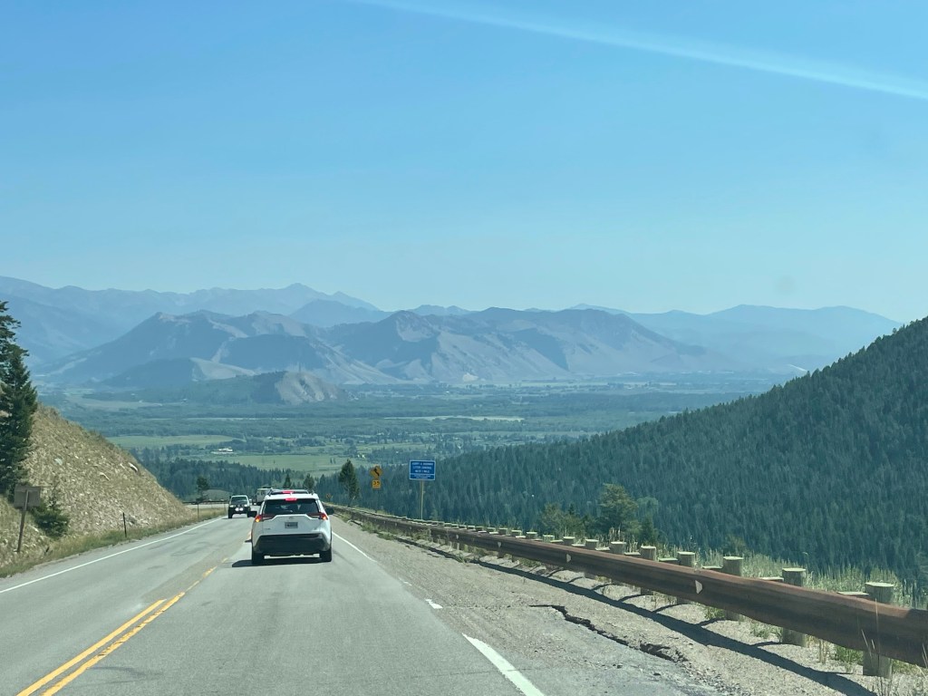 The most exciting section of the drive was going through the Teton Pass which starts in Idaho and about halfway up, crosses into Wyoming. This was not like a typical mountain highway with switchbacks. Instead the road seemed to be straight up, then straight down. And the gradient was 10 percent most places. At the top, we look down into Jackson Hole.