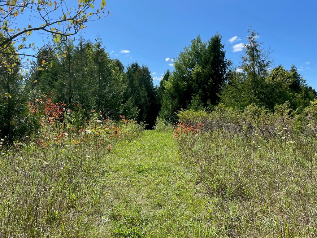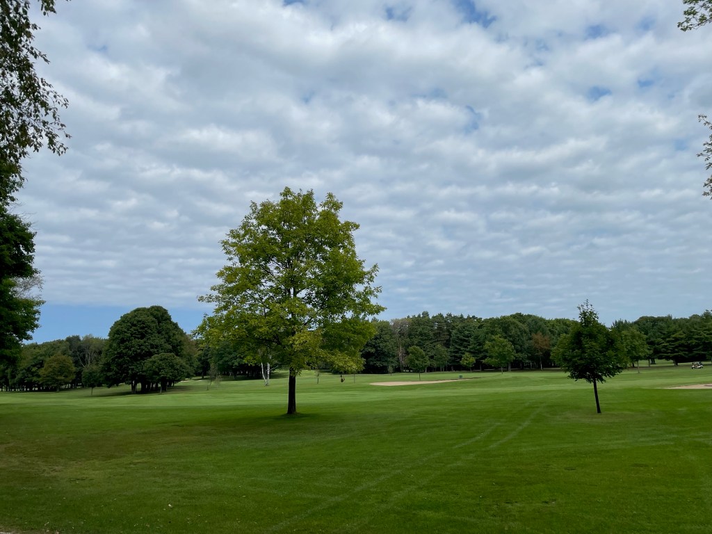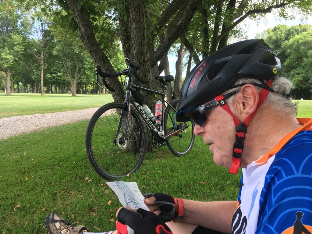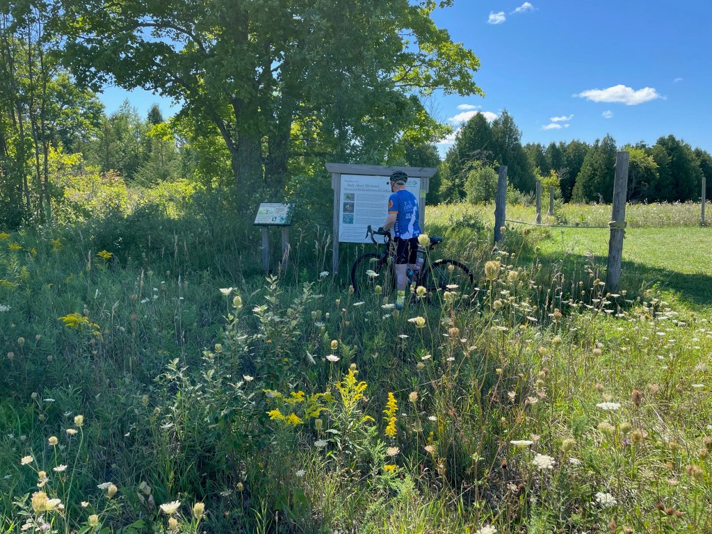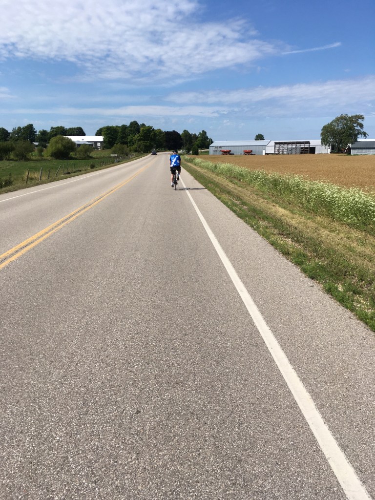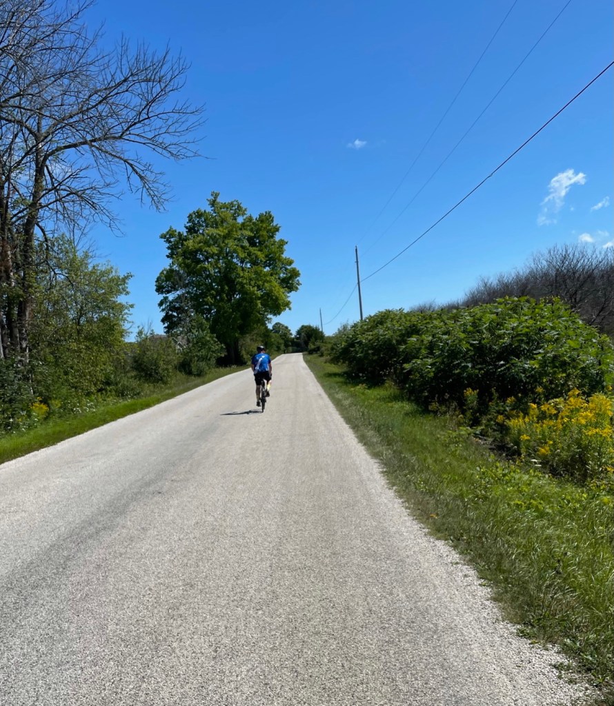 We had cooler weather today, in the 70s, but troublesome wind. This was our golf course loop ride, just a little over 20 miles round trip but it gives us some good, gentle uphill. We left Bailey’s Harbor via County Road F and then turned on to Maple Grove Road heading north.
