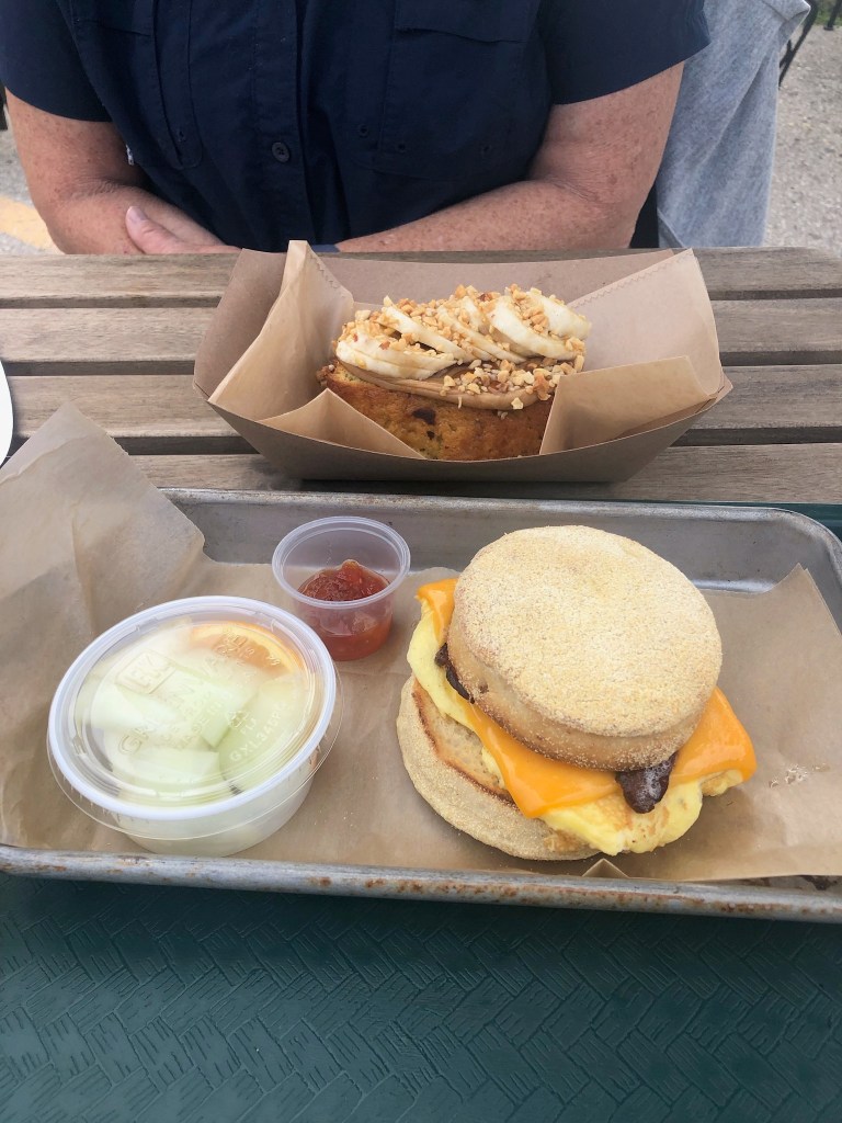 I went looking for avocado toast which was not on their limited menu and ended up with ‘Naner Bread which was peanut butter, bananas, peanuts, and honey on a piece of banana bread. Yum. Ross got their Egg Sammy with bacon. They also serve lunch and close around 2:30.