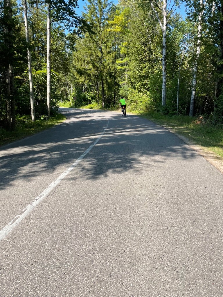 To add to our frustration, there was a nasty 300-foot section of uphill on Shore Road just before it curves to go up to Eagle Tower. We were able to turn off in the middle of this nasty hill – what a relief – to head in the other direction on Skyline Road. Ross made it up. I just quit halfway and walked. It was super busy there too with bicyclists riding down as well as up, mopeds buzzing around, and cars going back and forth. The park is a busy place. Lots of campgrounds within it add to the busyness. Plus, the bike path crosses the main road in several places and creates additional traffic to dodge. All this is likely why we choose not to ride there often.