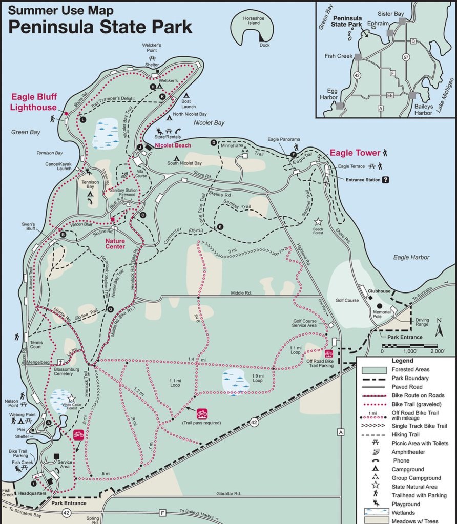 Gibraltar took us to State Route 42 in Fish Creek. After a quick stop at the bike shop, we rode into Peninsula State Park, a 3,700 acre park with several miles along the Green Bay shoreline. We saw a lot of those acres and miles today.