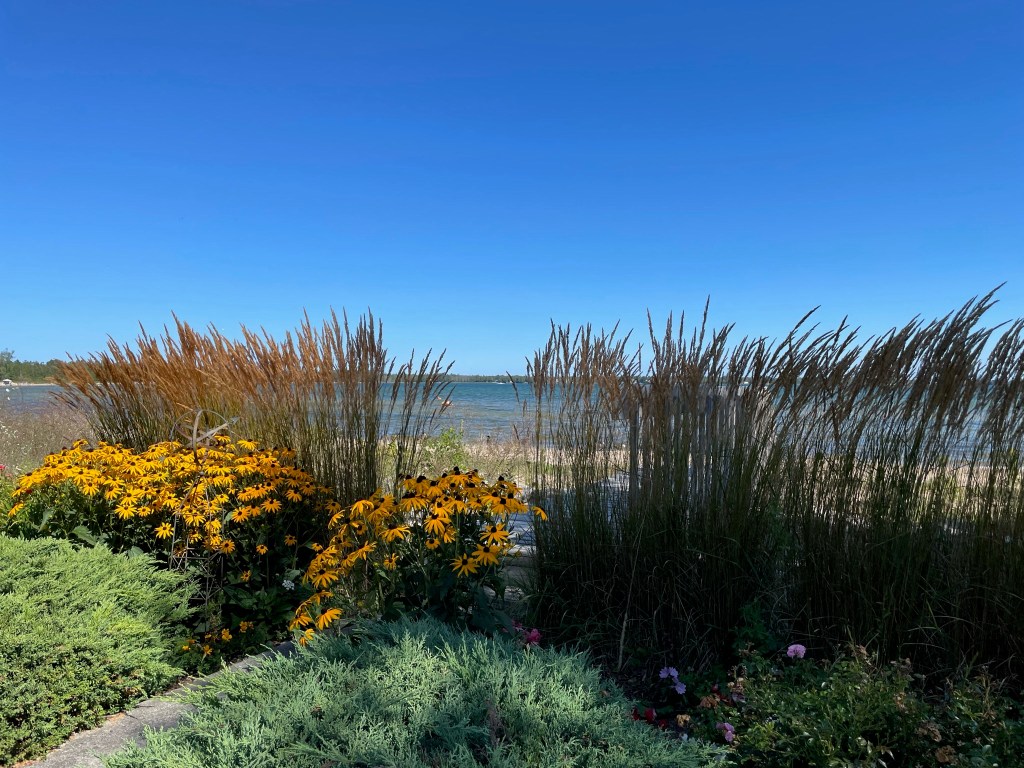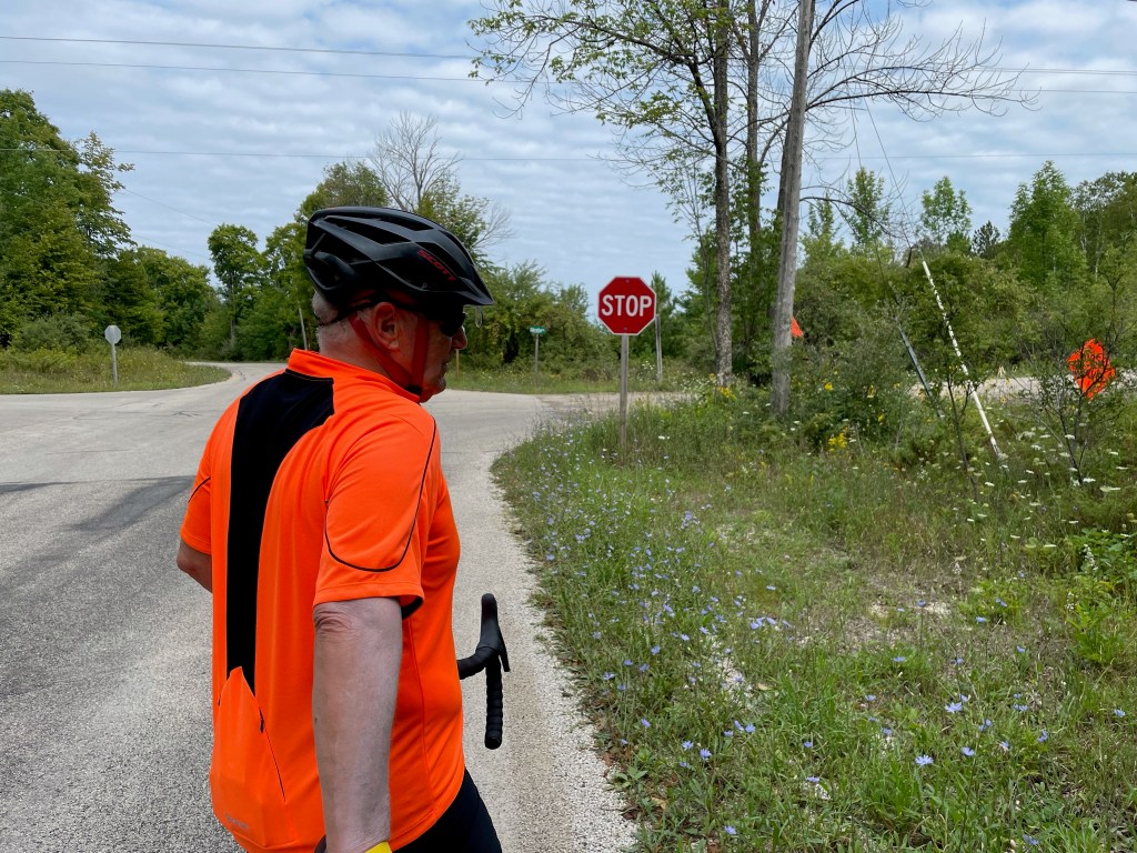 Instead we took a side road, “High Plateau,” and were rewarded with a couple of miles of mostly downhill. Our recompense came when we reached County Road EE, turned left, and went uphill until we reached Red Cherry Road. Red Cherry took us back to the Coyote Roadhouse and we stopped for ice cream. We went home across Kangaroo Lake and took Red Cherry to Summit Road and from there went into Bailey’s Harbor. On the way to the Yacht Club we stopped to take a look at the lake along Ridges Road.