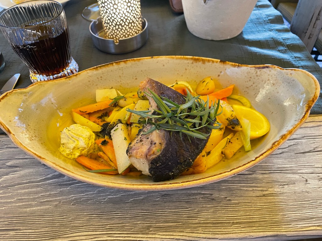 I had some kind of fish with vegetables.