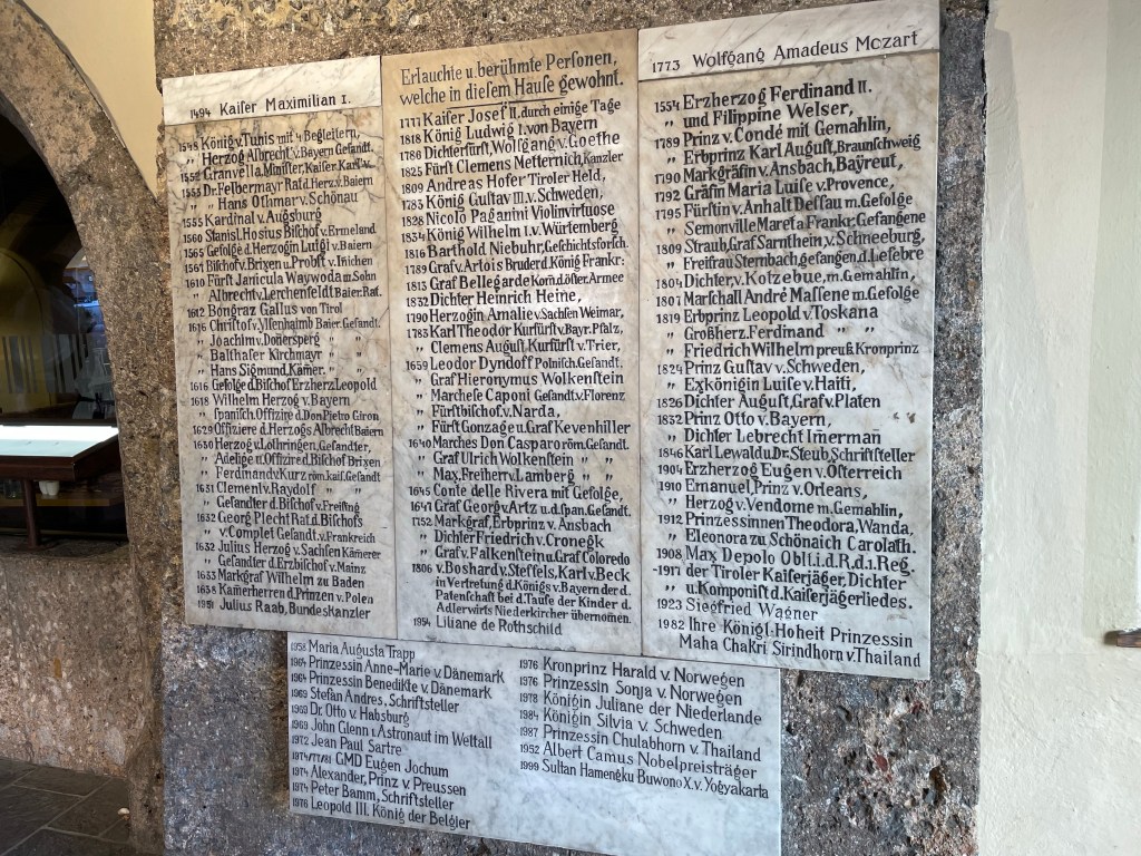 Our restaurant from last night is on this same street and Monica took us back there to point out the hotel that is connected to the restaurant and a list of famous people who have stayed in that hotel including Mozart in 1773 and John Glen in 1969.