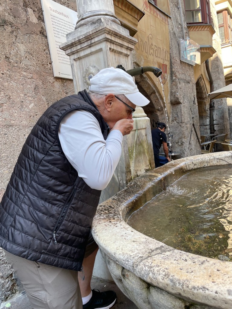 She took us to a water spigot that we could drink from to explain how pure the water is in the city. Monica explained that the water is from the Alps and flows for years through the rocks gathering minerals before reaching the fountains in Innsbruck. Ross thought it tasted good.