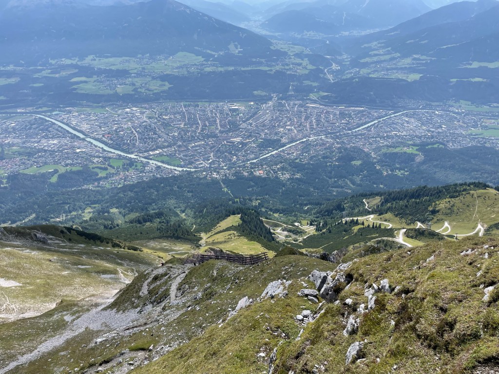 The view from near the top of Mt. Hafelekar with the Inn River far below.