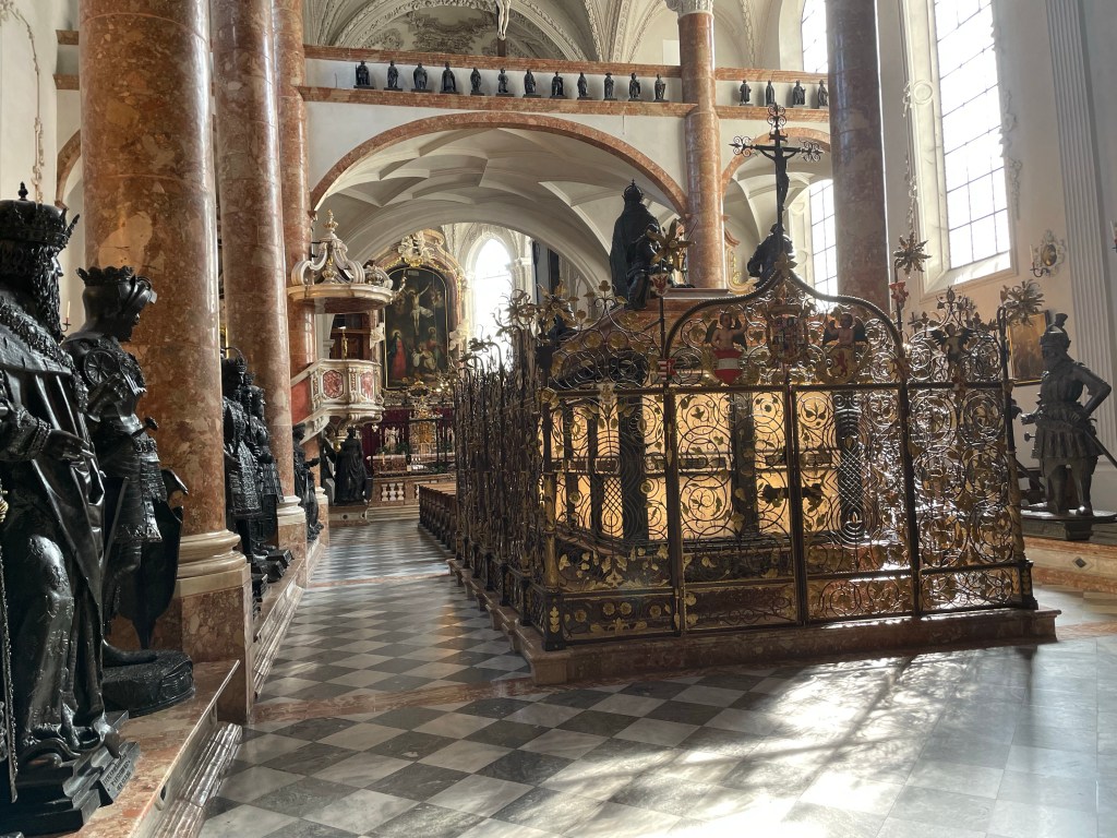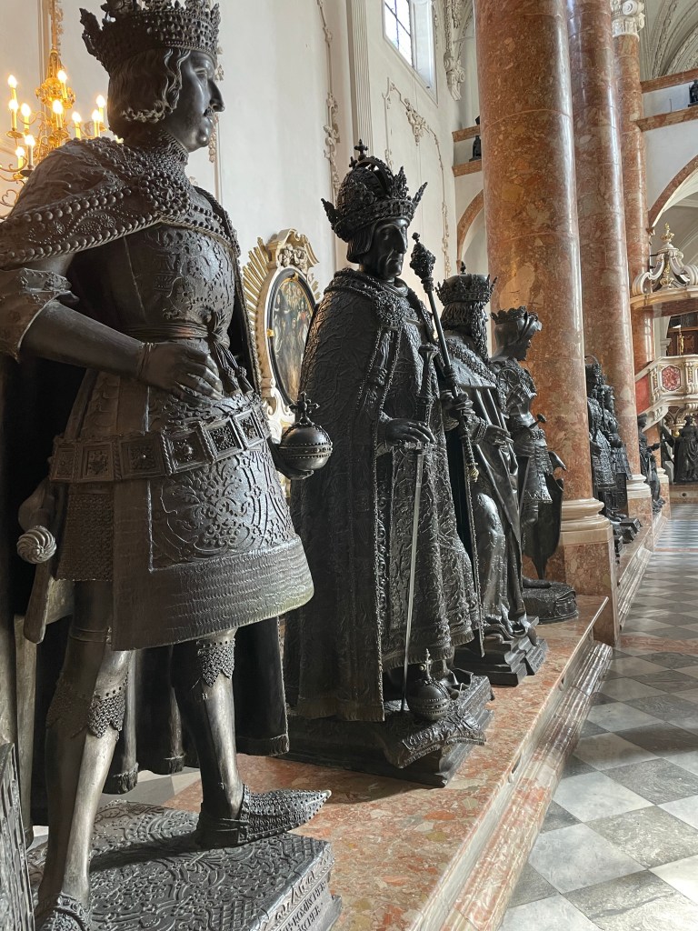 The church and tomb were constructed by Emperor Ferdinand, as a memorial to his grandfather years after Maximilian’s death in 1519 but Maximilian was buried at Weiner Neustadt and his remains are still there and not in Innsbruck. Most interesting in the Hofkirche were the 28 life-size bronze statues that were also created to represent Maximilian’s relatives and heroes including the fictional King Arthur.