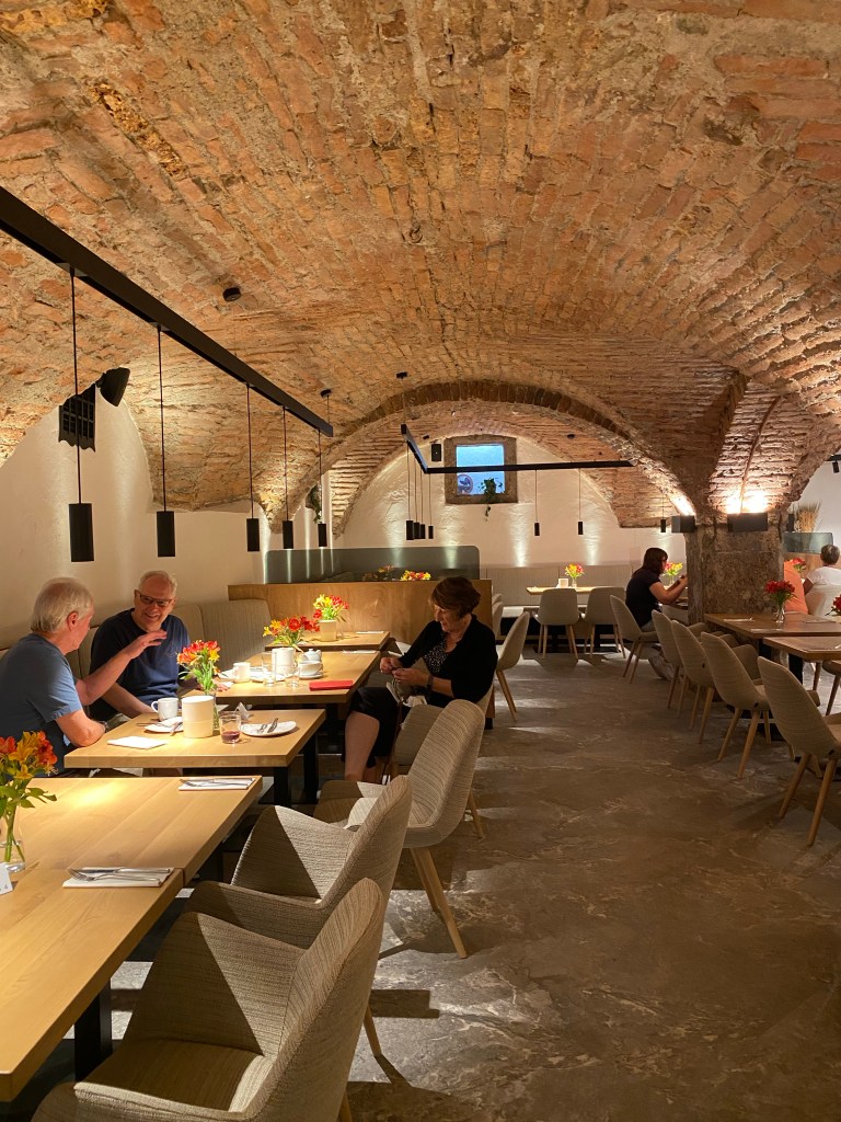 The next morning we had breakfast at the hotel in a very old section of the basement. We probably had our best breakfasts of the trip here or at least the most expansive. This included a selection of various types of bread, croissants, and muffins along with jams, honey, and Nutella; a table of cereals and nuts including Ross’ favorite muesli; fresh cut up fruit; cheeses and cold cuts; and a warm offering of scrambled eggs, undercooked bacon, and beans. Ross loves European breakfasts; they just don’t know how to do bacon.