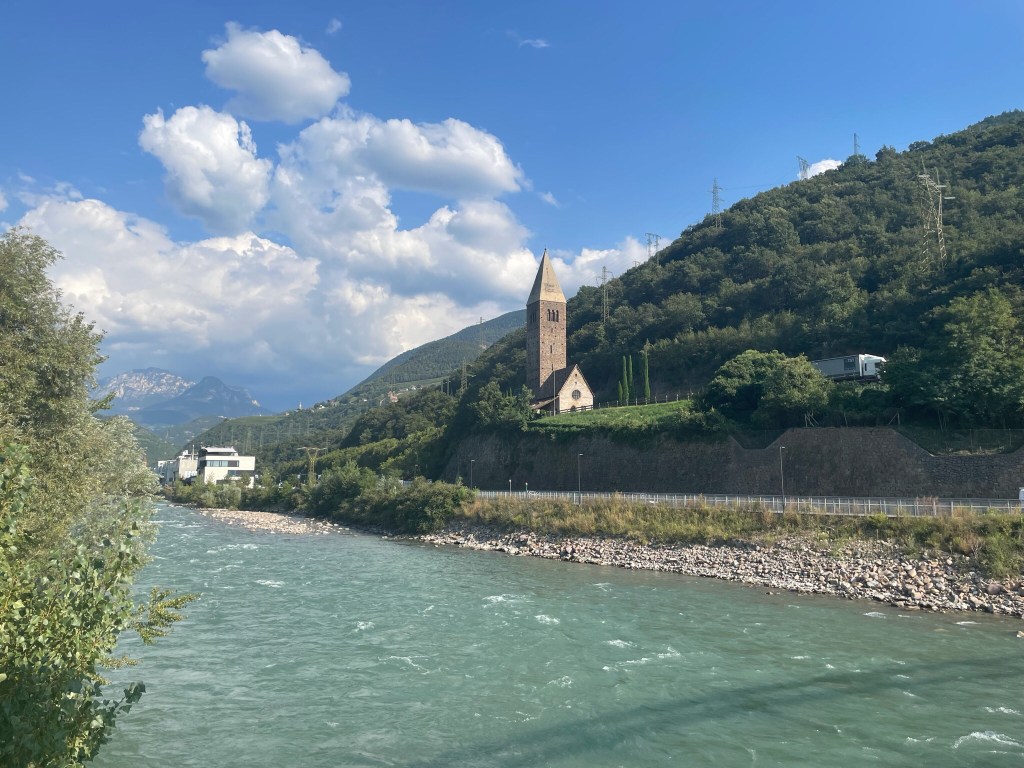After partially retracing our steps, we crossed a street and went on to a different section of the bike path that took us along the Isarco River with the Rosengarten Mountain range in the distance. We passed by vineyards and apple orchards, a sight that would become familiar in the next few days.