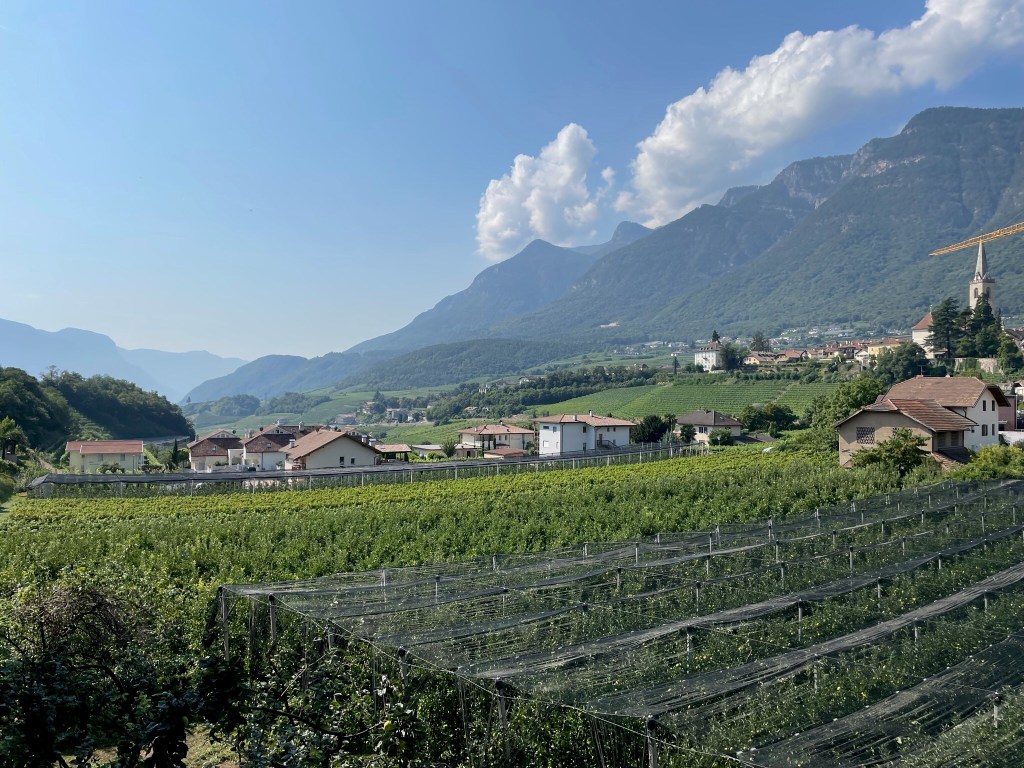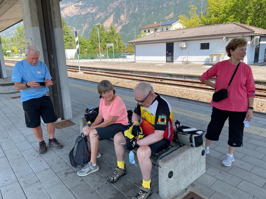 At the end of this section was a stop sign that turned on to a really busy two-lane highway. Traffic was pretty constant along here. After a couple of miles, another left turn put us on a slightly smaller two-lane road that was also busy but mostly with smaller orchard and vineyard tractors towing wagons. This area was still thick with orchards. We had ridden eight miles since lunch and there were eleven more to ride into Bolzano but we were pooped and hot. Several of us elected to stop riding in Ora and caught the train into Bolzano.