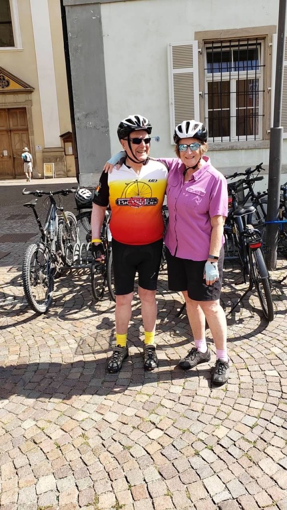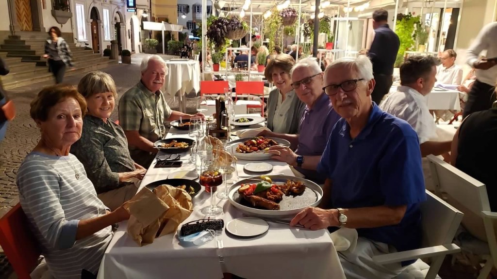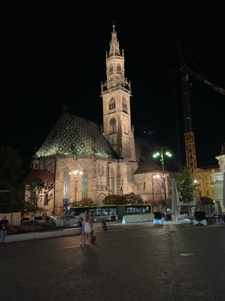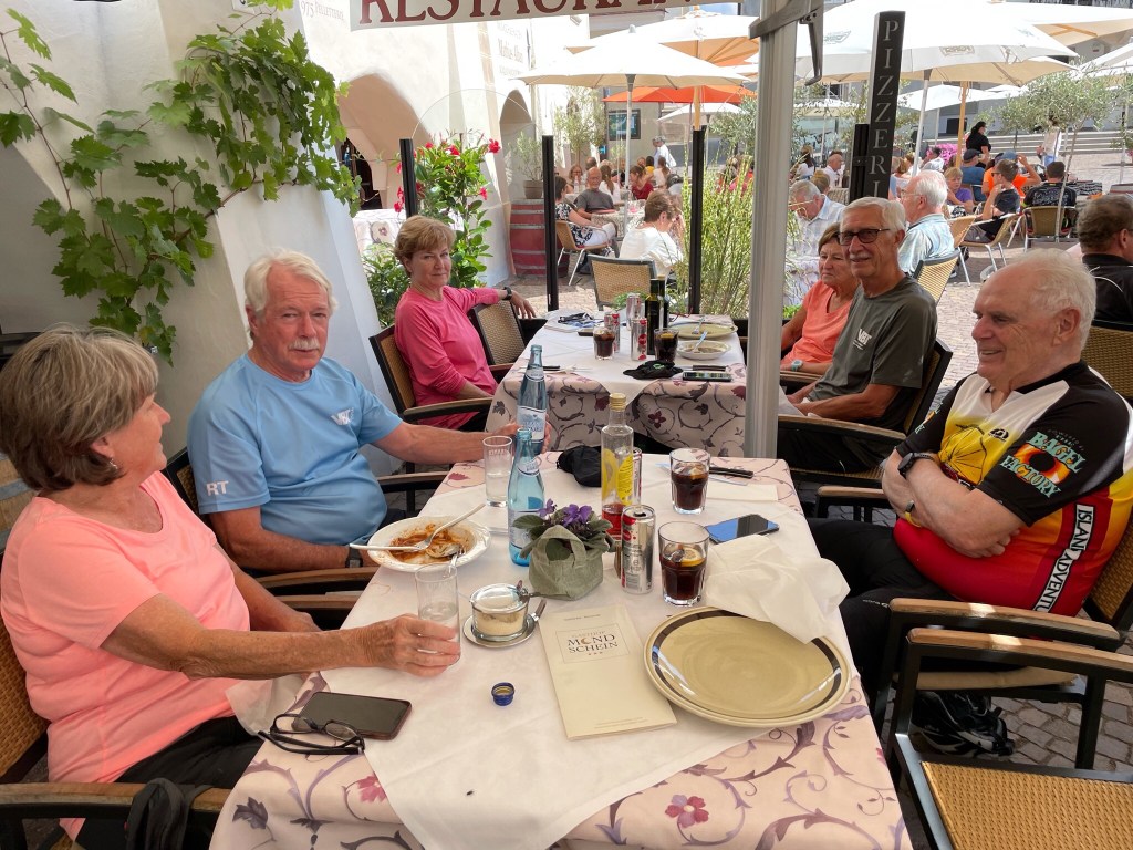 We took a photo of the church that we had ridden our bikes past the last two days. We knew we were riding by this church but in the daytime there were too many people and too much car and bicycle traffic to ever stop and take notice. Nice view for our final night in Bolzano. We went back to the hotel to pack up for our move to a different hotel tomorrow night.