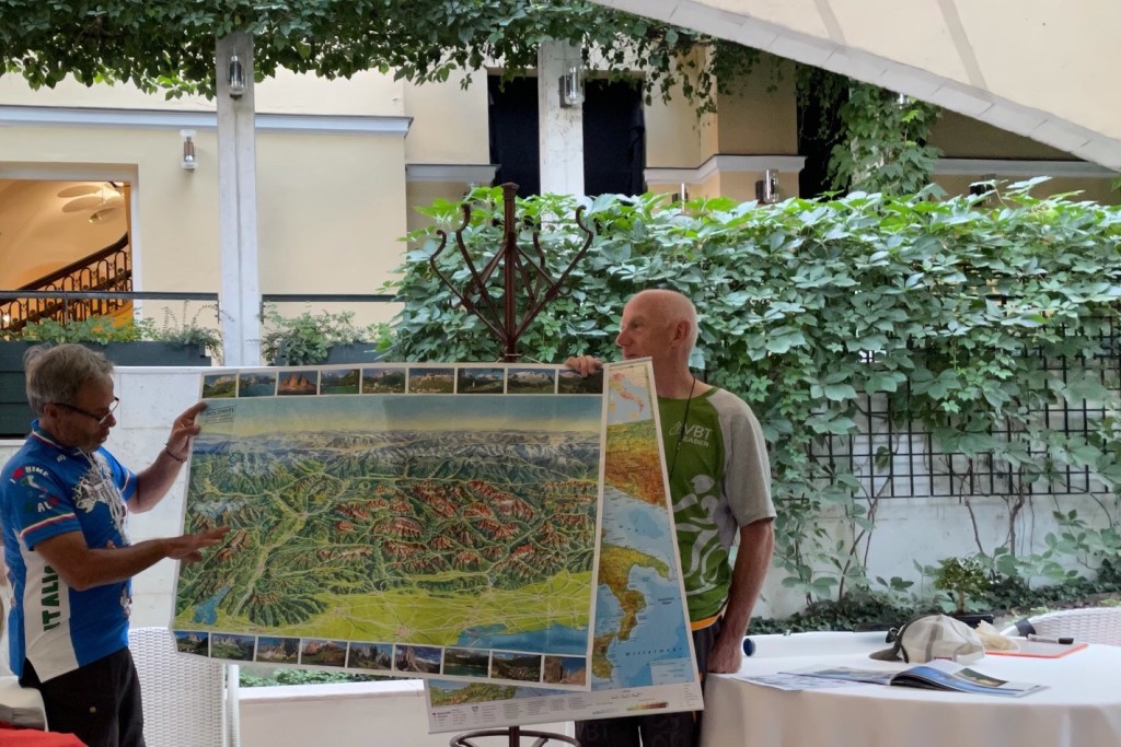 Afterwards, we went outside to the garden area for our route review. These were once detailed discussions of our written directions, but now mainly include a review of the map where we will be as well as highlights of the ride. During the review I discovered that the biking mirror that attached to my sunglasses was missing. So this meant a delay for me to start bicycling as I had to recheck our room and then search the grounds where we had been yesterday. All to no avail. I got through the ride using the mirror on the bike handlebars but luckily someone found my mirror and left it at the front desk later that day.