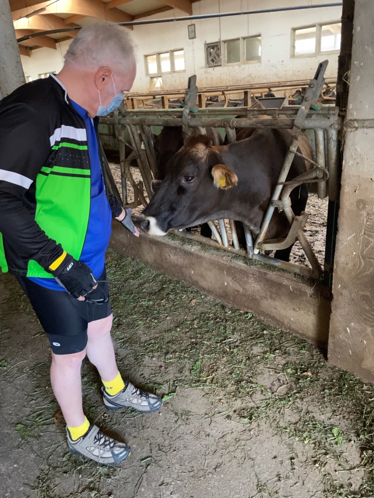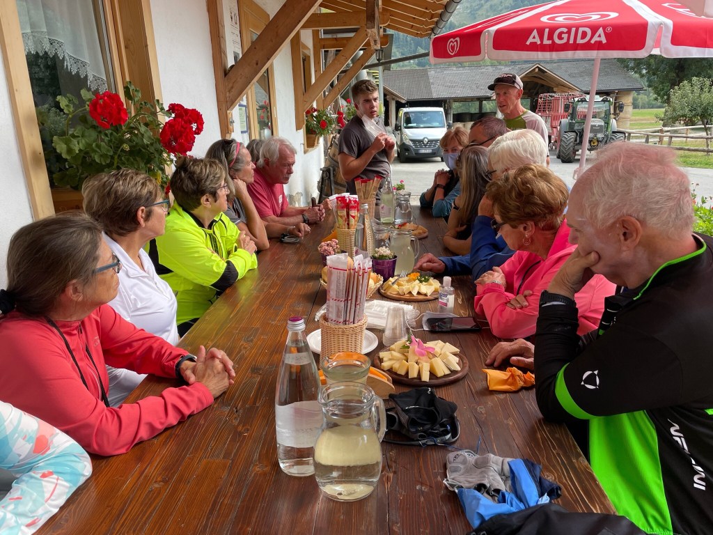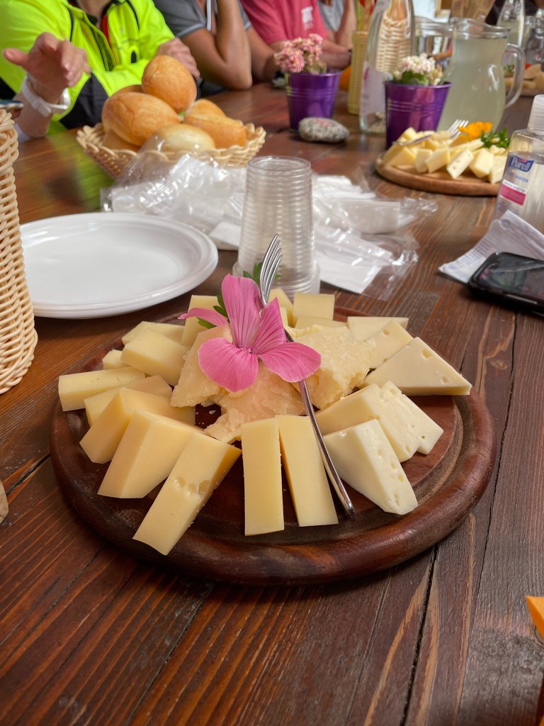 From there we rode up a narrow road until we reached a farm for cheese tasting. So far we had covered 13 miles. Upon arrival at the Maso Pan Farm, Claudio provided us with a fresh fruit spread – these snacks were the best. We always had chocolate as an option but the sliced peaches, nectarines, bananas, apples, etc., hit the spot.