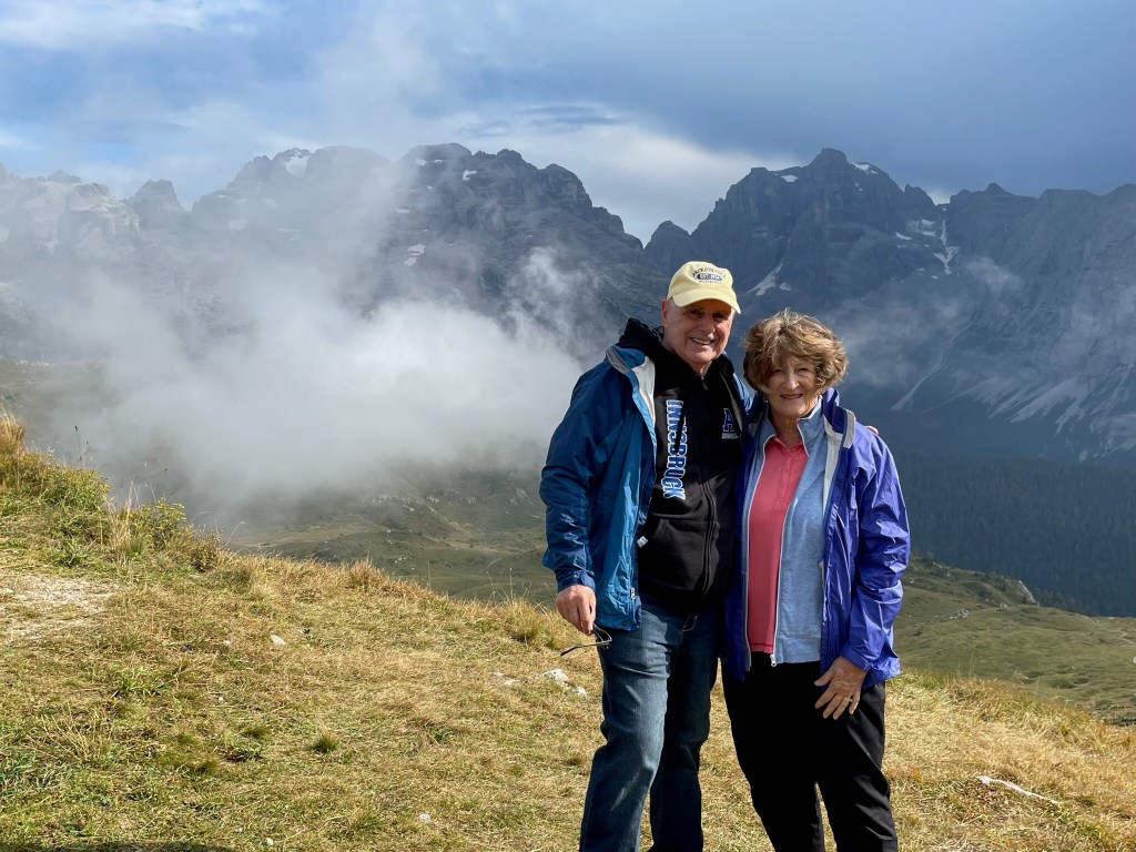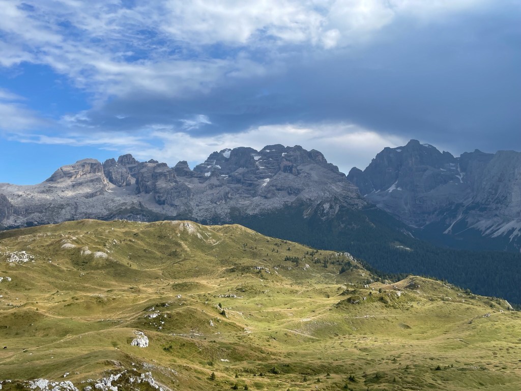 A wind blown photo of us with some clouds moving in. The Cima Brenta is toward the left and behind the cloud.