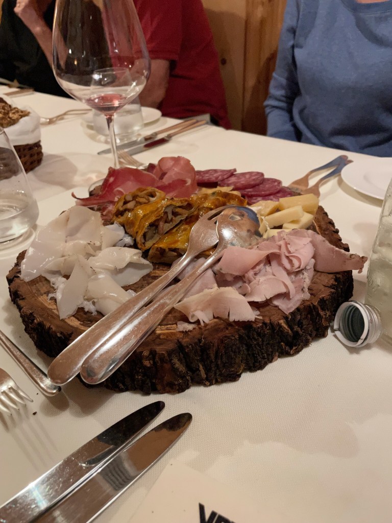 Dinner tonight was at the hotel again and included traditional dishes such as this meat, cheese, and salty strudel with mushrooms appetizer. The white stuff on the left was called “lard” and was basically slices of some type of fat.