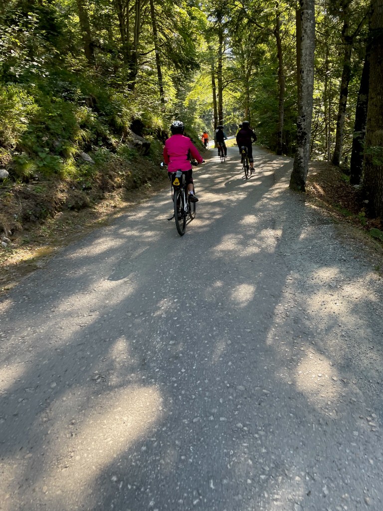 Our route for today was amid the Adamello and the Brenta Dolomites. We started by riding from the hotel and taking a road through the forest for a view of the mountains. This ride was mainly to pass some time so we would have less traffic on the upcoming downhill out of Madonna di Campiglio. But the forest road was very pleasant.