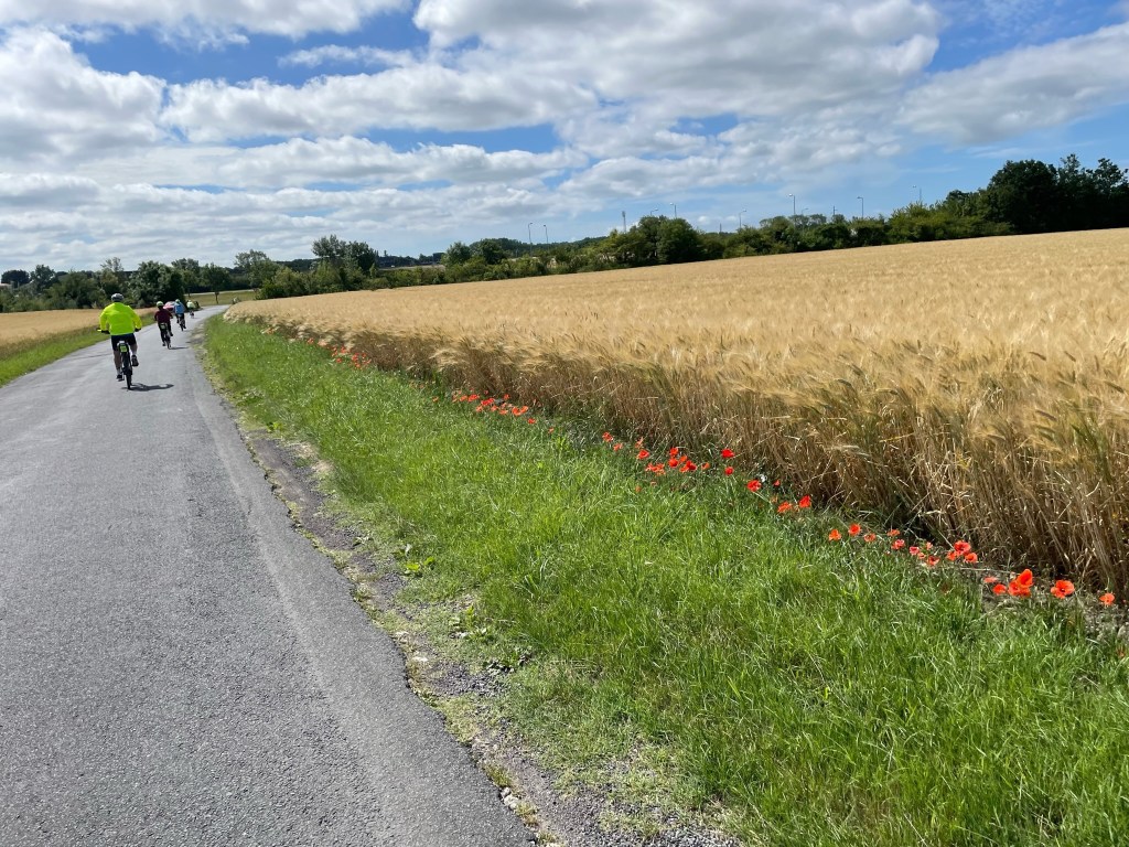 Here we are riding on a narrow road along a wheat field bordered by poppies.