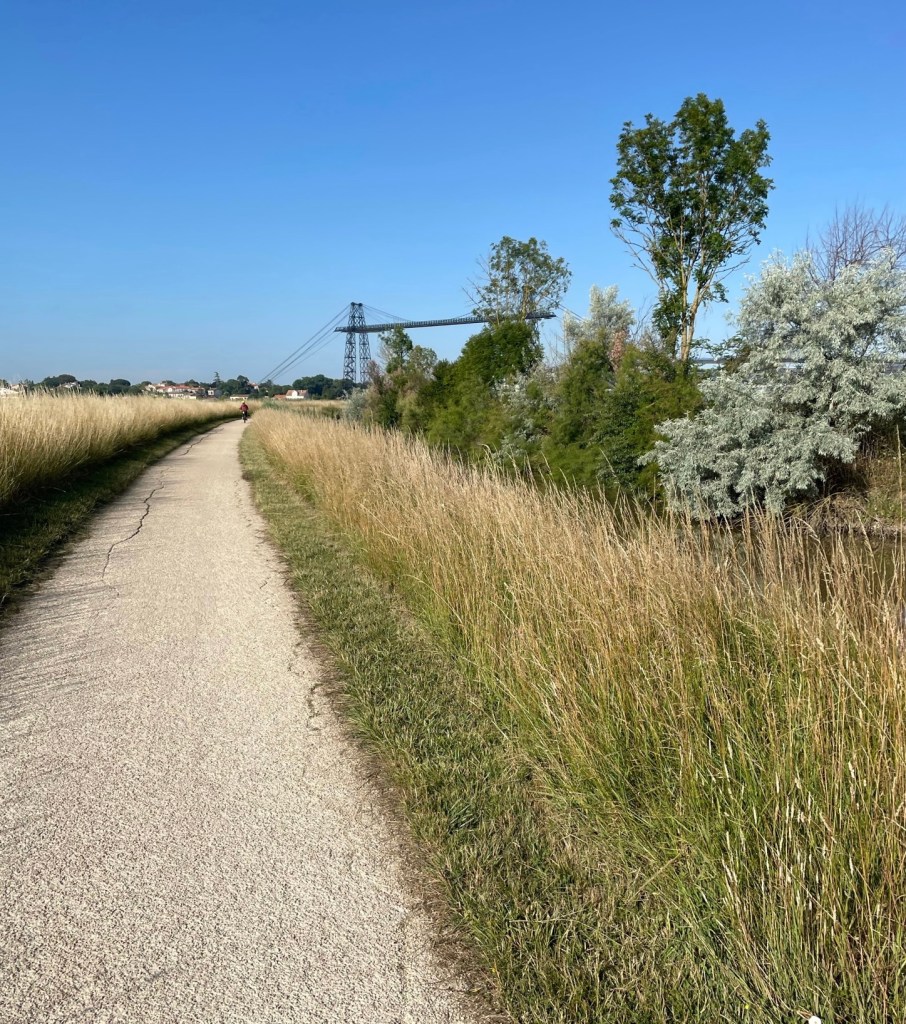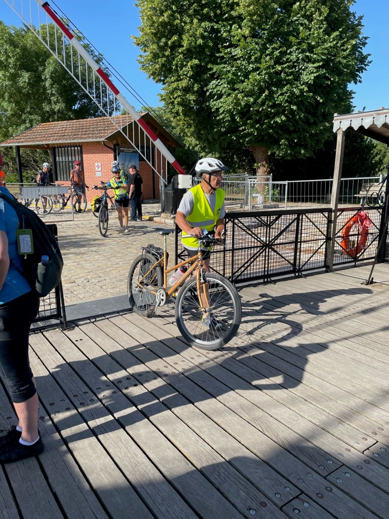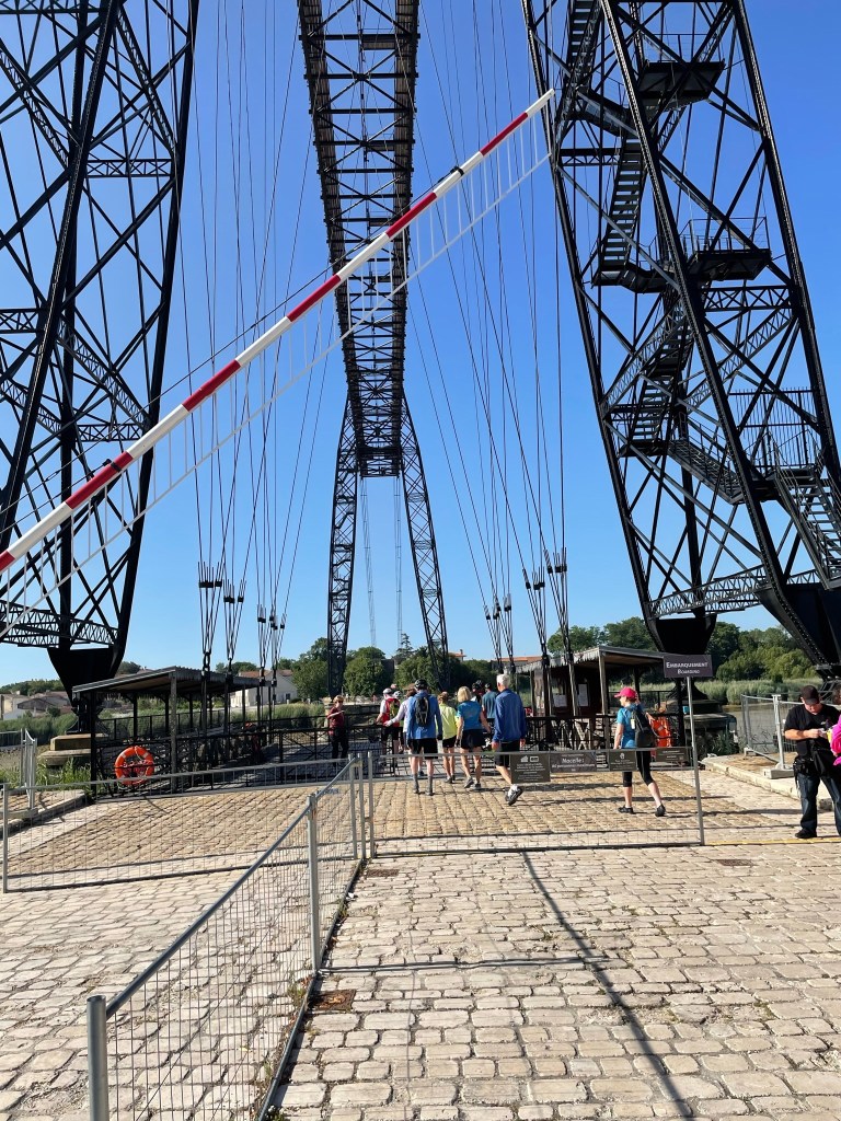 Then we ride towards the transporter bridge, the metal structure sticking up in the distance, which most of us missed yesterday; the last leg of yesterday’s ride came in across this bridge. It was built in 1900 and is the only remaining operating transporter in France. It goes across the Charente River and is currently available for use by pedestrians, bicycles, and mopeds.