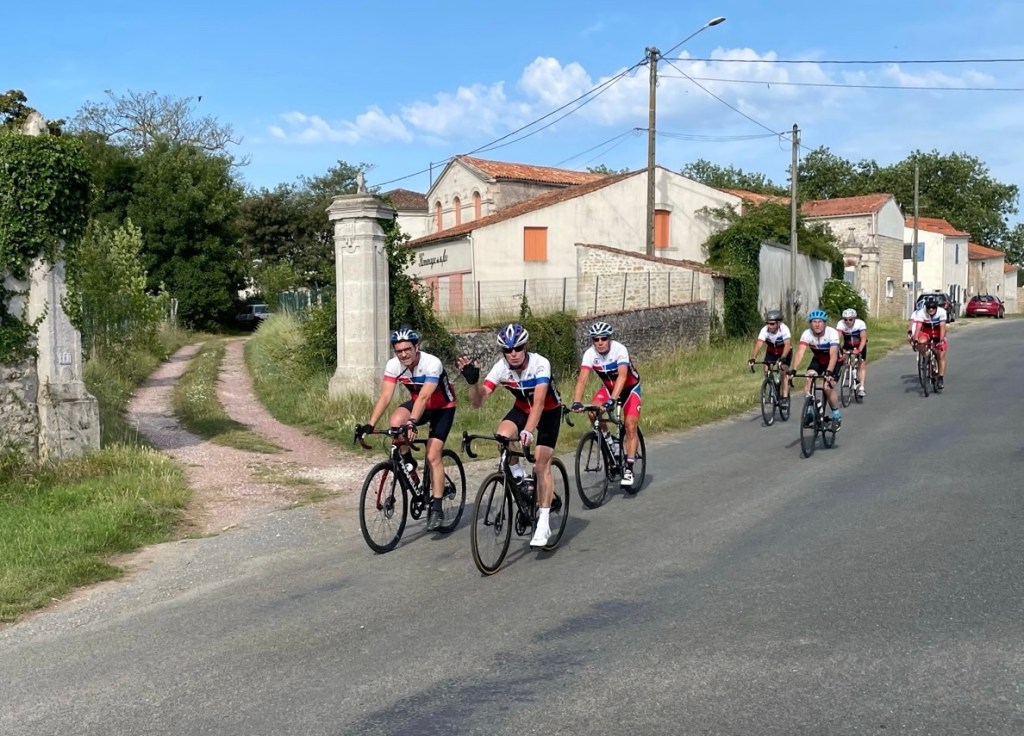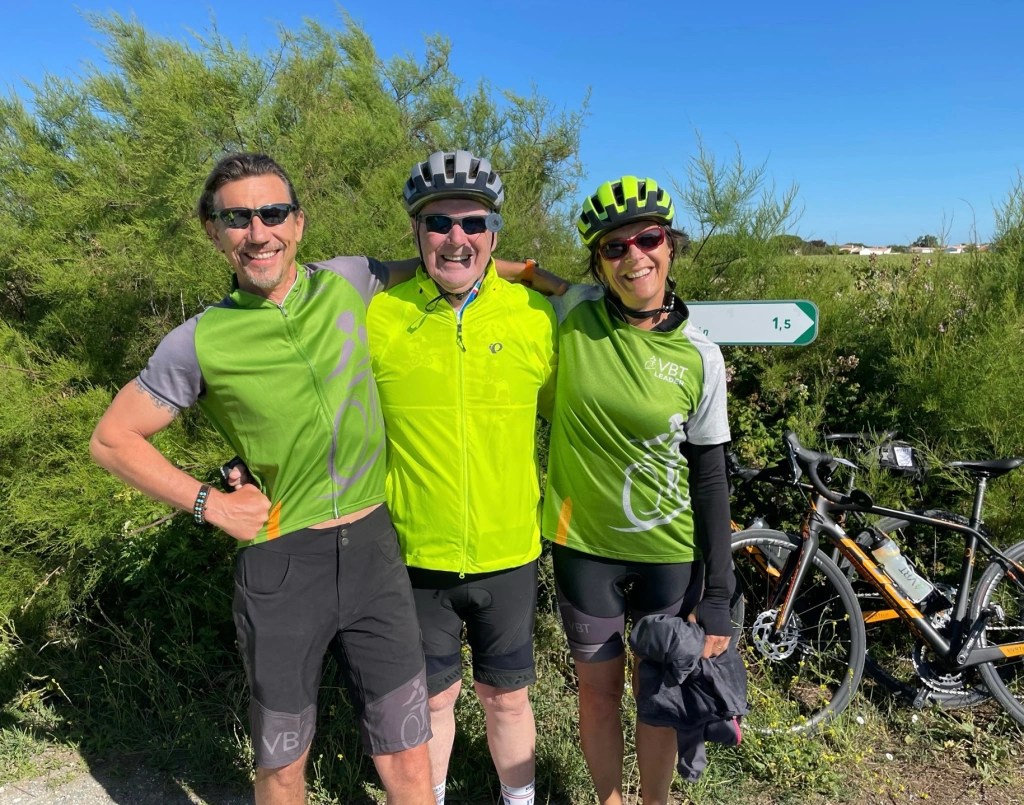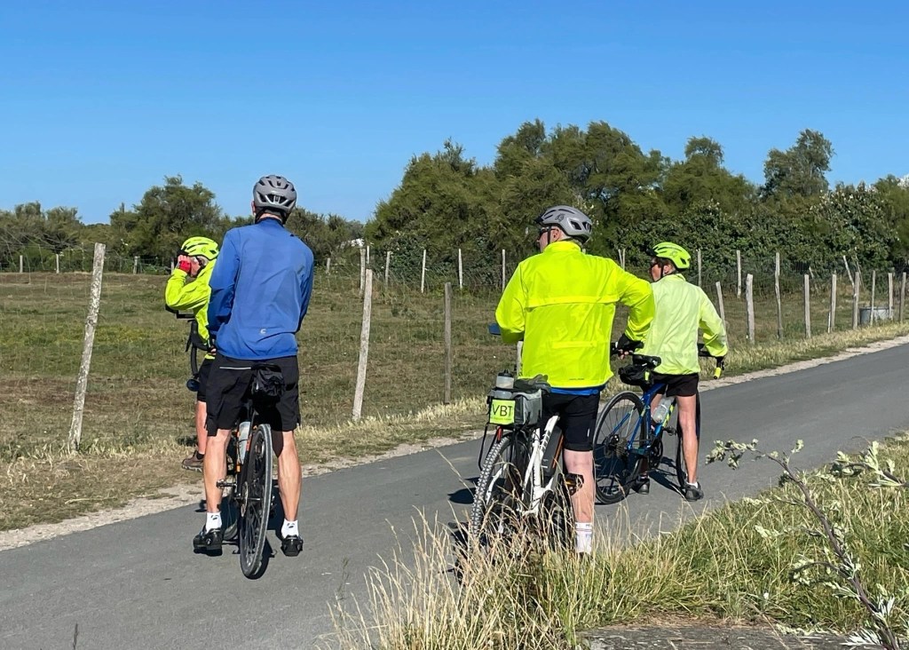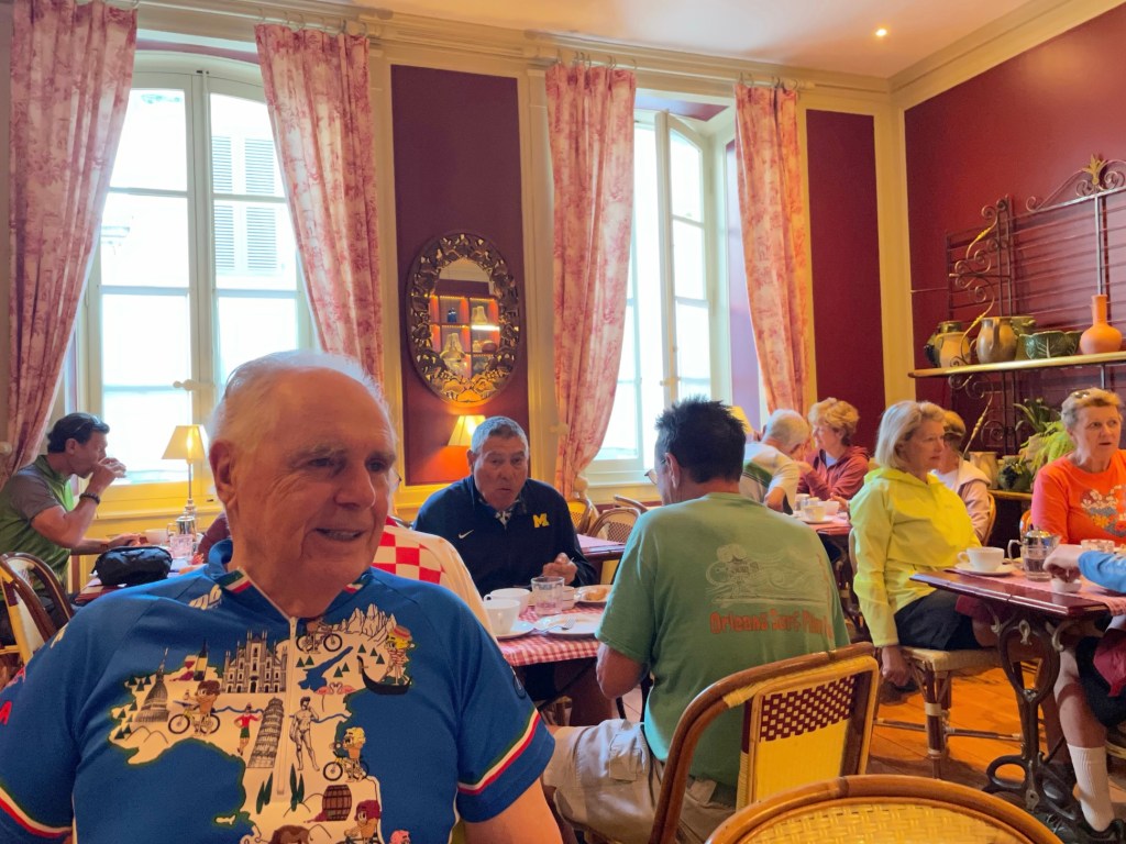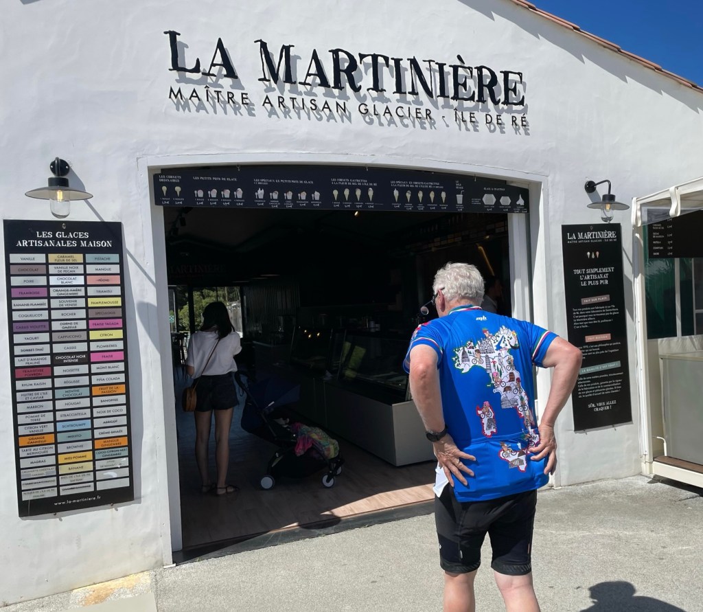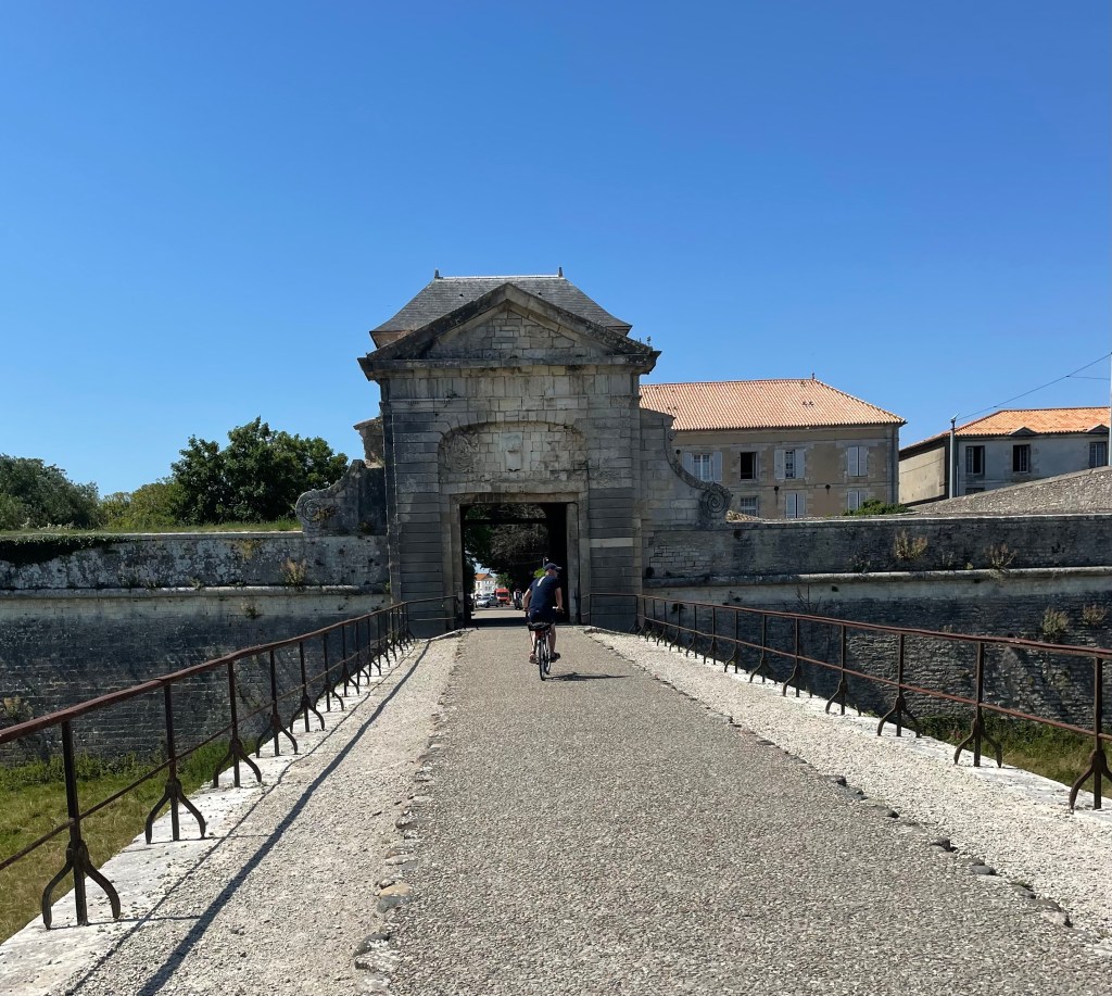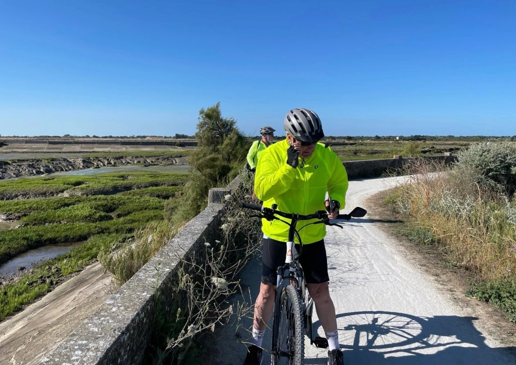 After lunch, Ross takes off to ride the 14-mile third leg of the day into Saint-Martin-de-Ré, one of several villages on Île de Ré. He’s in the blue/green jersey riding along the harbor on his way out of La Rochelle. Four others in our group also rode that section and the remaining eight of us took the van to the hotel. I planned to ride this leg but changed my mind based on the temperature, which was in the upper 80s, and the big bridge we would have to ride across on what had become a windy day.