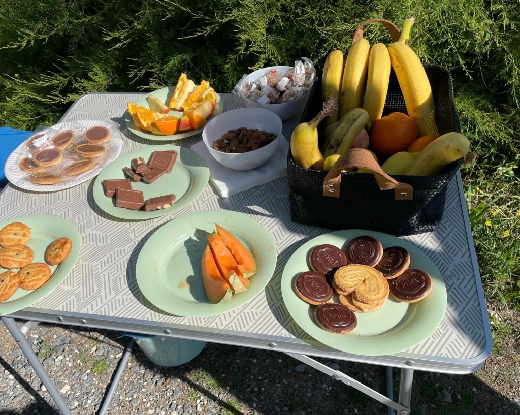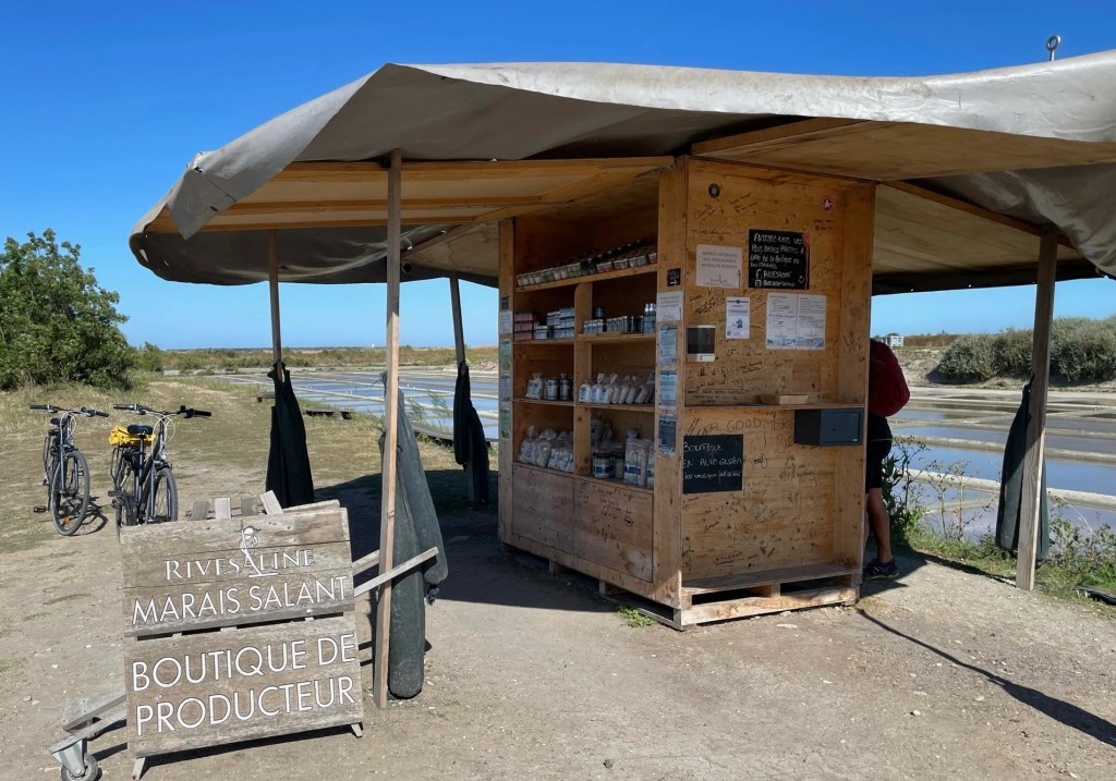Fleur de sel being sold at an unmanned booth/honor system along the bike path. Salt flats in the background.