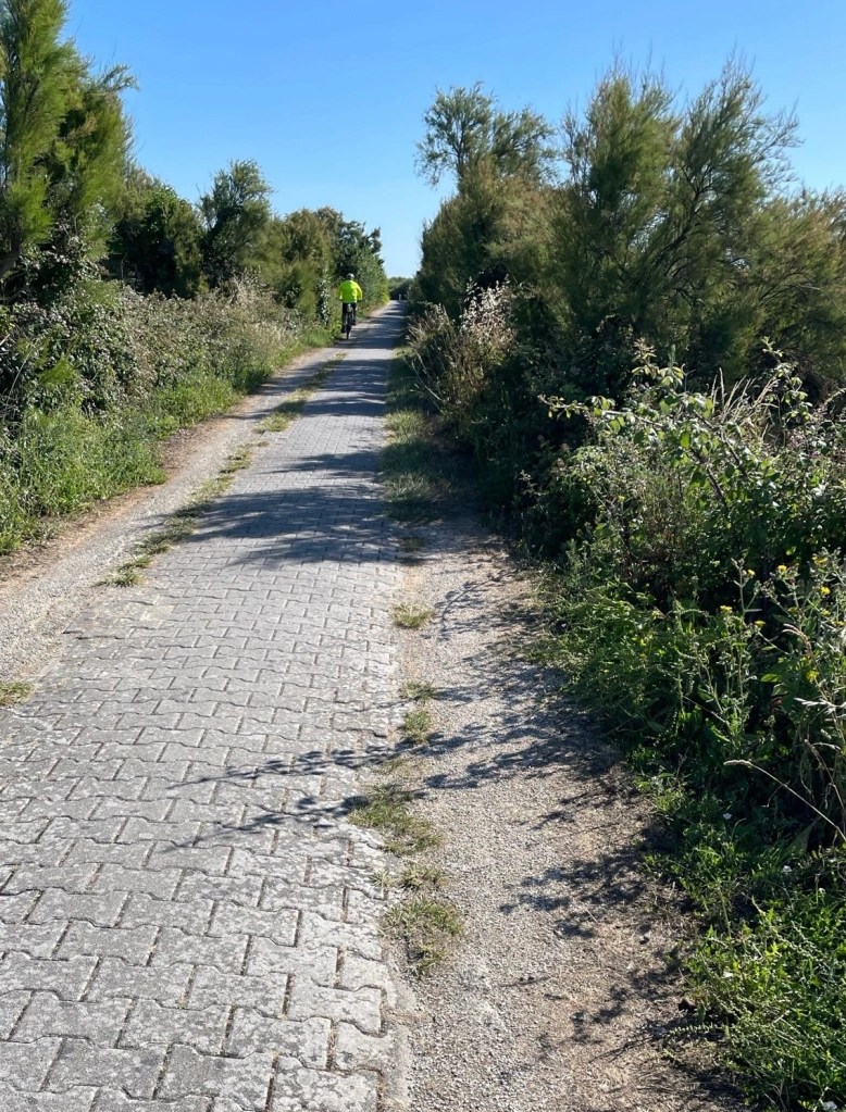 Part of the bike trail along a marshy area and low stone walls. This area is also a natural reserve for birds.