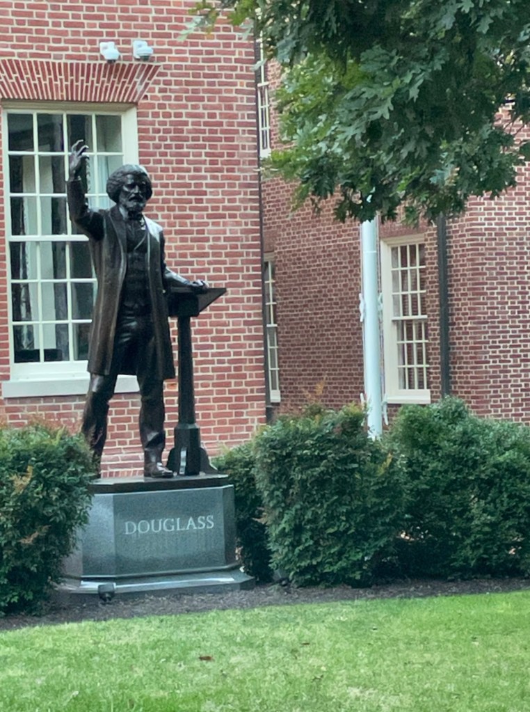 A statue of Frederick Douglas stands before the Talbot County Courthouse in Easton. He was born a slave in Talbot County in 1818 and was arrested planning to escape and held prisoner here in 1836. The statue depicts him making a speech in the main courtroom in 1878.