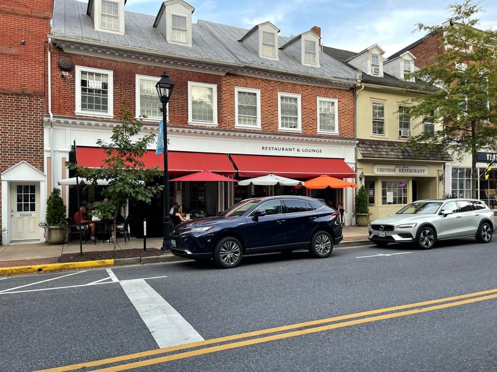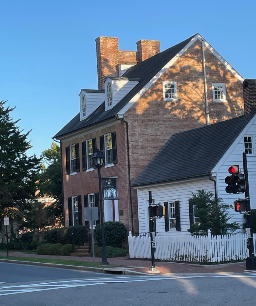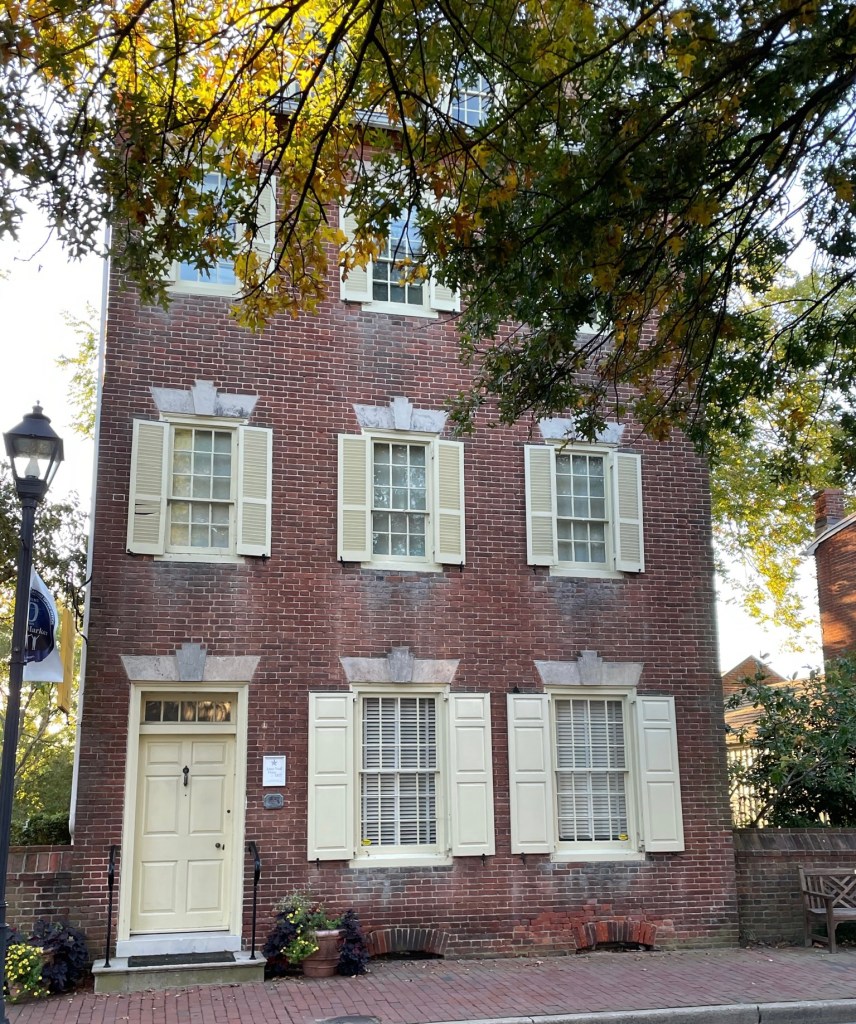 After parking our bikes, we clean up, rest a bit then a local guide leads us on a tour of downtown Easton. We learn that the town dates from the early 18th century and has a current population of about 16,000. He first pointed out the Bullitt House just across the street from our hotel. It was built in 1801 as a residence and law office for Thomas Bullitt. Our guide noted the little white storage area on the roof which was used to store sand that could be used to extinguish a fire in the chimneys.