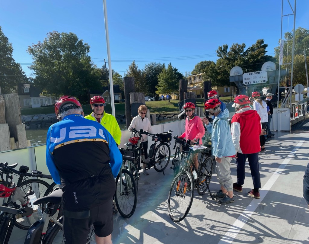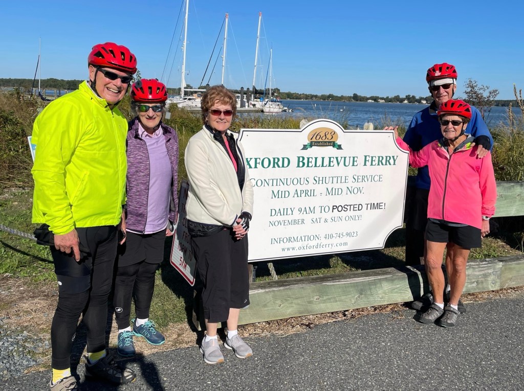 We arrive in Oxford and wait for the ferry to take us across the Tred Avon River. On this trip we are bicycling with friends Debby, Marylou, and Jerry plus 15 other people from around the U.S. Ross and I are the ones still in leg warmers.