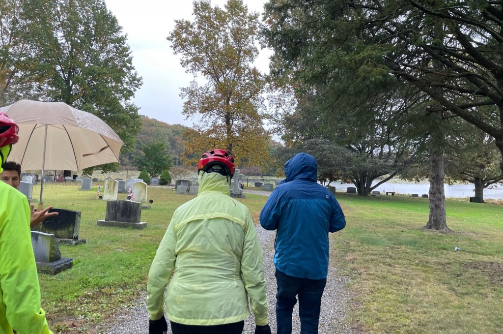 All week the forecast had been for rain today. First it was 90 percent, then 70 percent, and finally 50 percent with thunderstorms in the afternoon. So we chose not to ride today but to follow the GPS route in Debby’s car. First stop – in the rain – was at St. Paul’s Kent Churchyard.