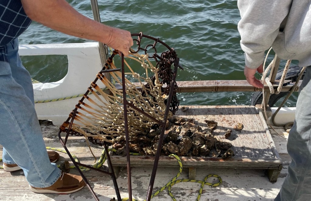 In very short order he pulled in some oysters. The daily limit now is 10 bushels and the oysters must be three inches in width. The limit was set in 1965 but our boat was built in 1955 when 1,000 bushels could be harvested in a day. The dredge he used today is small in comparison to the 150-pound commercial dredge they regularly use. And that dredge cannot be pulled in by hand. A working crew spends the day dredging, sorting and throwing undersize oysters back into the water. Also, he told us the larger oysters in this pile would be 10-12 years old.