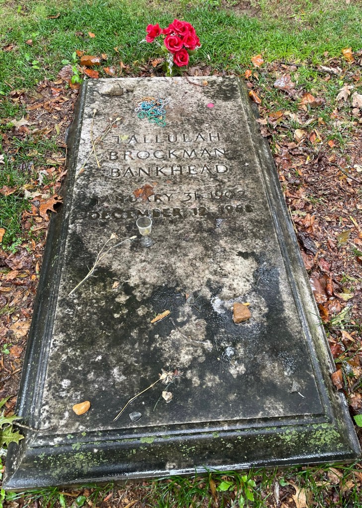 We stopped here to see the grave of the actress Tallulah Bankhead. Most of us were old enough to remember her. She was actually born in Alabama, passed away in New York, but was buried in Rock Hall because her sister lived here and her sister was later buried next to her. Various items had recently been left on top of the stone, including a martini glass, a cigarette, coins, and necklaces.