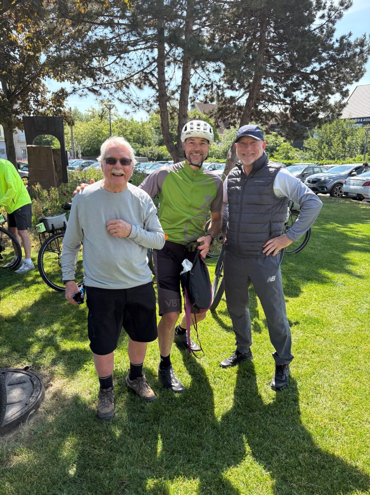 After getting back to their bikes at the van stop, the ride continued along the route here with the Vosges Mountains and an abandoned castle in the background. Both of these are shown in the map the guides drew for us this morning.