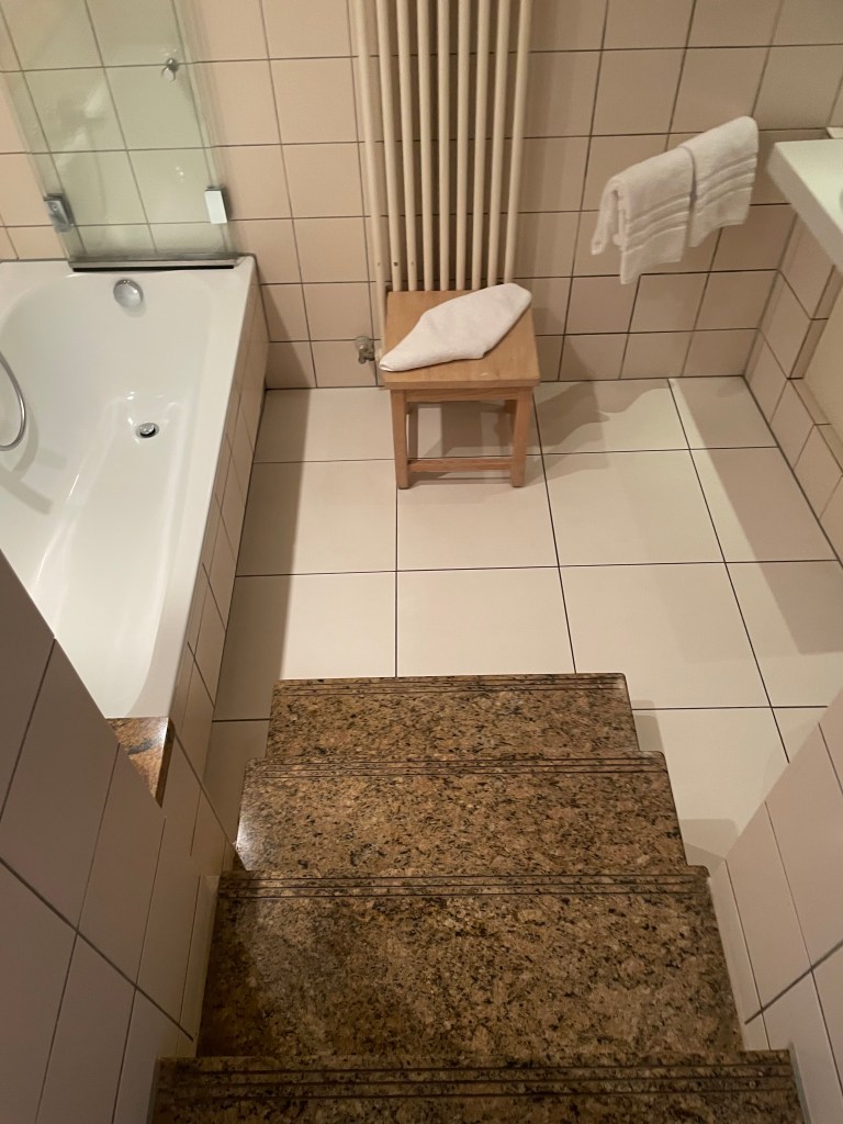 The only tiny potential issue is that the bathroom is four steps lower than the bedroom.