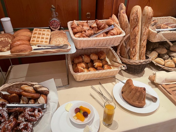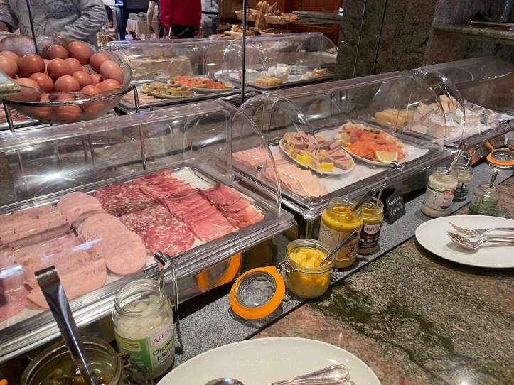 And the breads. Another table holds the hot foods which almost always includes scrambled eggs, sausages, and undercooked bacon. Sometimes really, really undercooked. The one thing I was anticipating and sorely missed on this trip was a plethora of varieties of pickles. In fact, there were few pickles of any kind. I thought being in Germany, past and present, that pickles would be ubiquitous. But, disappointingly, not so.