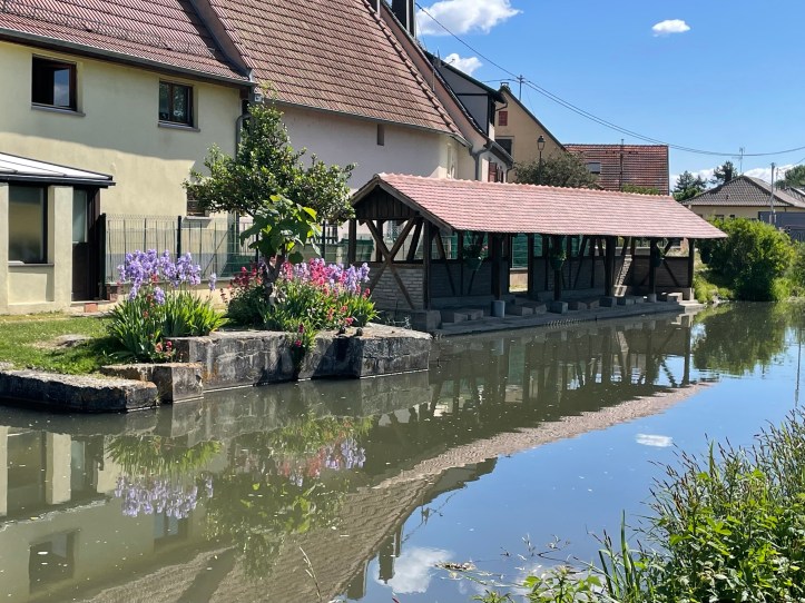 Our route today is around Obernai with some interesting side attractions. In Molshiem is the one and only Bugatti factory. Our guide said you have to be on their “list” in order to buy one and have to already own one to be on the list. Hmmm. Then there is the potential to see the stork nursery. This is actually a refuge for injured storks, but there also happens to be a nest with babies nearby. We were told that 15 years ago there were only 15 or 16 stork couples left in the area and now that has increased substantially. We are also going to ride by the Canal de la Bruche designed by Vauban, our architect friend of Louis XIV, in the early 1700s. This canal was still in commercial use, shipping goods to Strasbourg, until 1957.