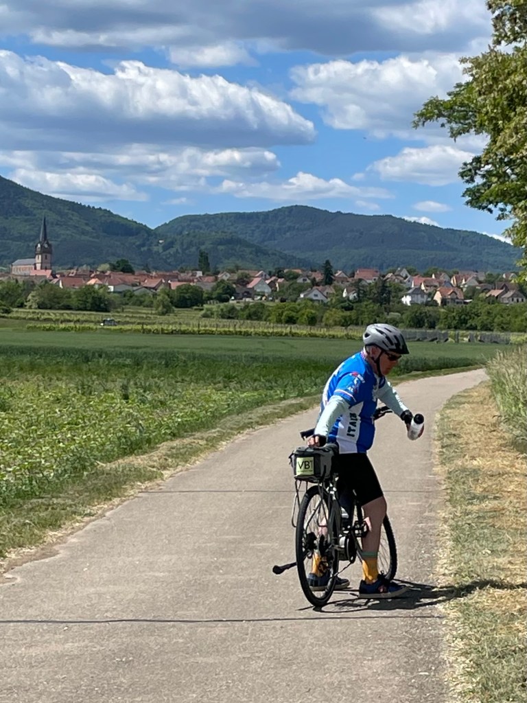 Had to have a photo of Ross struggling with his water bottle. It had to be hooked on behind the bike bag and it was always a pain to turn around to get it and then have to fasten it back. Obernai in the distance.