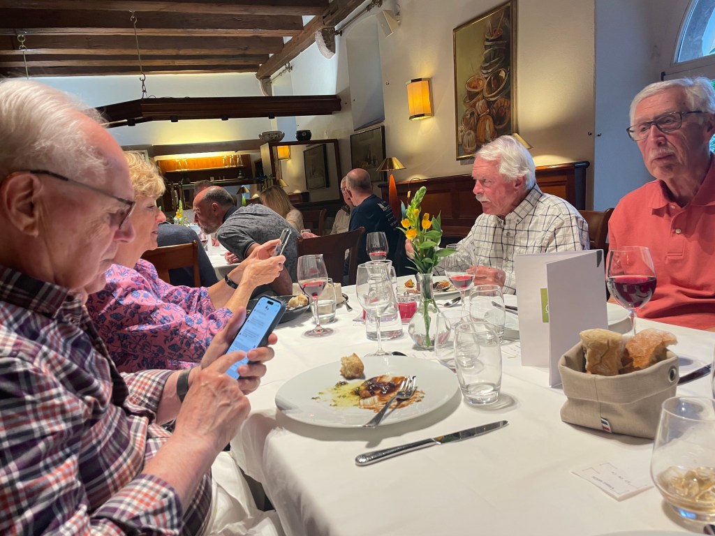 Sharing photos over dinner.