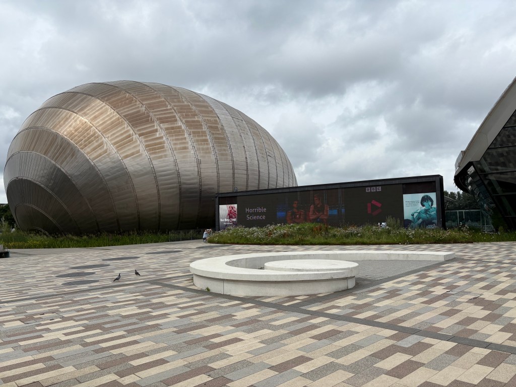 We walk along the Clyde to reach our first destination for the day, the Glasgow Science Center. There we check out the Planetarium and the IMAX Cinema – our film focused on dinosaurs – as well as the multiple interactive exhibits on the three floors of the Science Mall. We spent several hours here and just be sure to bring your antiseptic wipes. Lots of hands-on stuff.