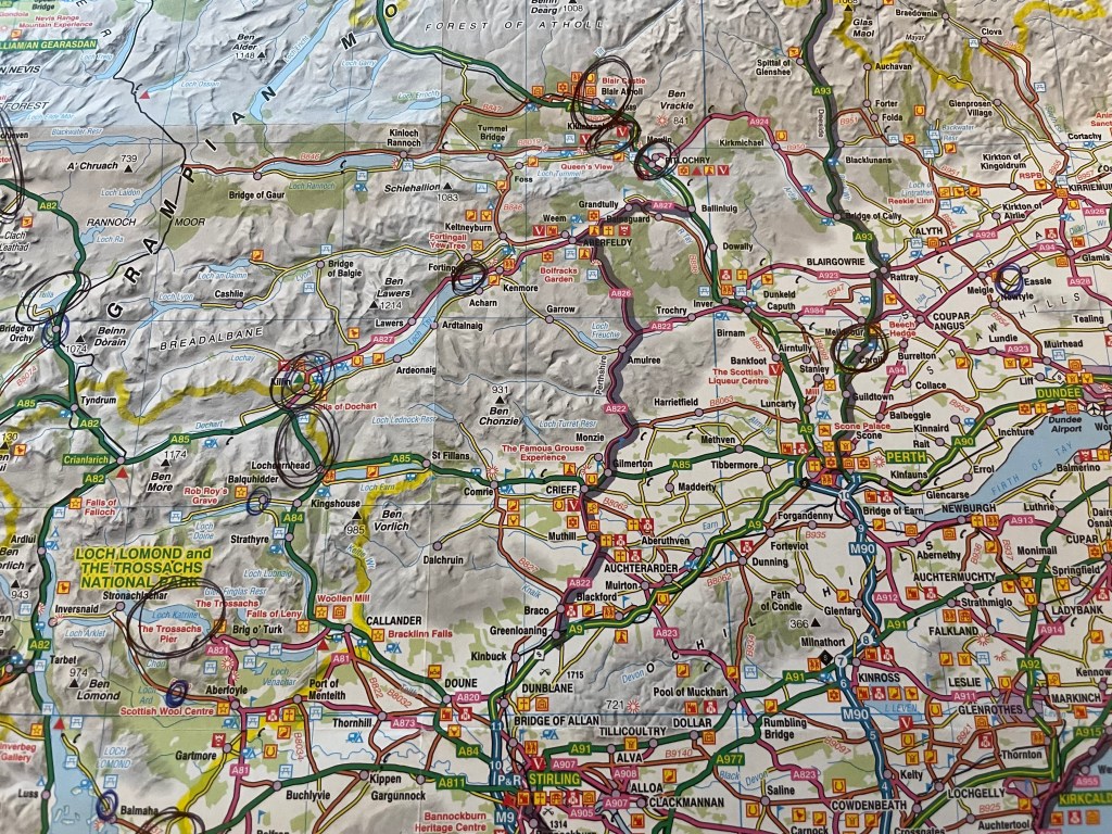 Looking at the map of where we were today. Our first hike was in the circled area on the far left, the Bridge of Orchy and Loch Tulla. Then we went to Killin for lunch near the western end of Loch Tay. Our visit to the Crannog Centre took us to the other end of Loch Tay, near Kenmore. Our hotel is in the lower circle on the right, north of Stanley and along the River Tay.
