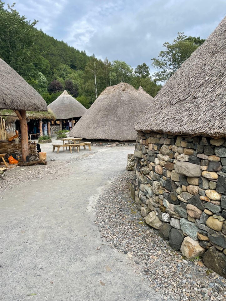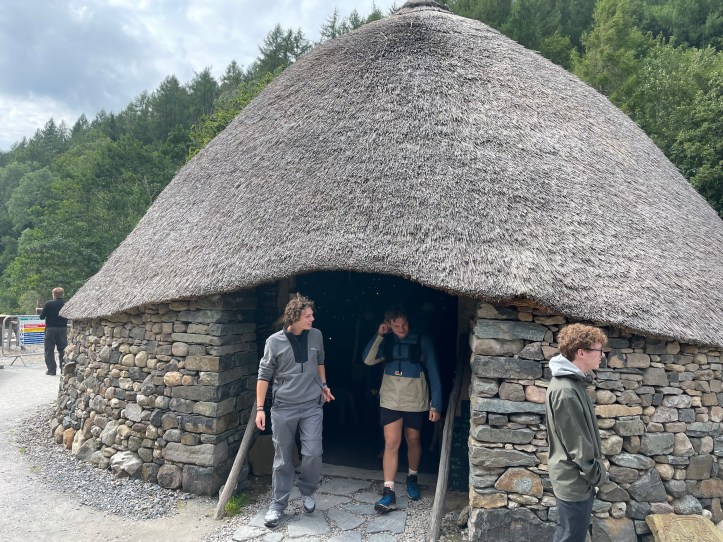 Crannogs were also built on the water for defensive purposes; the Centre is currently constructing one on the water. Our guides told us that the little islands with trees we frequently have seen in lochs are likely above a sunken Crannog. There is evidence of 18 such Crannogs on Loch Tay alone.